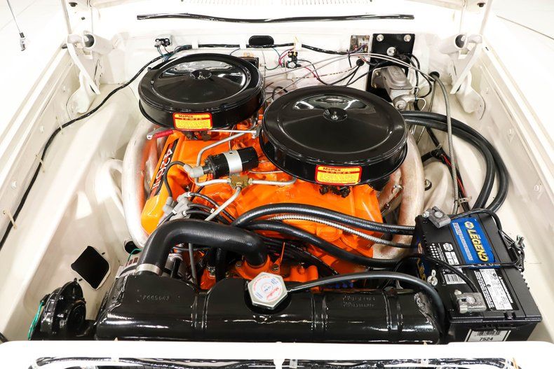 ENGINE COMPARTMENT: Professionally built! A 440 was bored .040", stroked and Dyno tested at 656 hp and 662 lbs of torque! The now 512 cubic inch Max Wedge engine looks stock and is equipped with a Mopar cross-ram intake, Max wedge exhaust manifolds, Edelbrock 800 cfm carbs, forged crankshaft, forged connecting rods, flat top pistons, solid roller camshaft (.650" exhaust lift and 303 duration), Indy cylinder heads, full roller timing chain and much more. Everything is fresh and clean with neatly applied Hemi Orange paint. All the hoses, wires and belts look like new. The battery is properly secured; master cylinder upgraded to a dual reservoir. The radiator looks fresh, and the horns are hooked up too. The underside of the hood is cut out just like the factory did to accommodate the dual quads. The fender wells and firewall have all been painted slick just like the body.