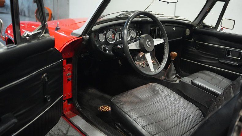 This 1975 MG MGB came from Tennessee, where its previous owner fulfilled his wife's dream of owning a classic British roadster. The red paint gives this convertible a vibrant personality, while the black vinyl top provides a sharp contrast. The classic 14-inch wheels, fitted with 185/65R14 tires, give this MGB its proper British sports car stance. A luggage rack adorns the trunk lid, completing the quintessential British roadster look. Front and rear chrome bumpers maintain their original finish, complementing the overall presentation.