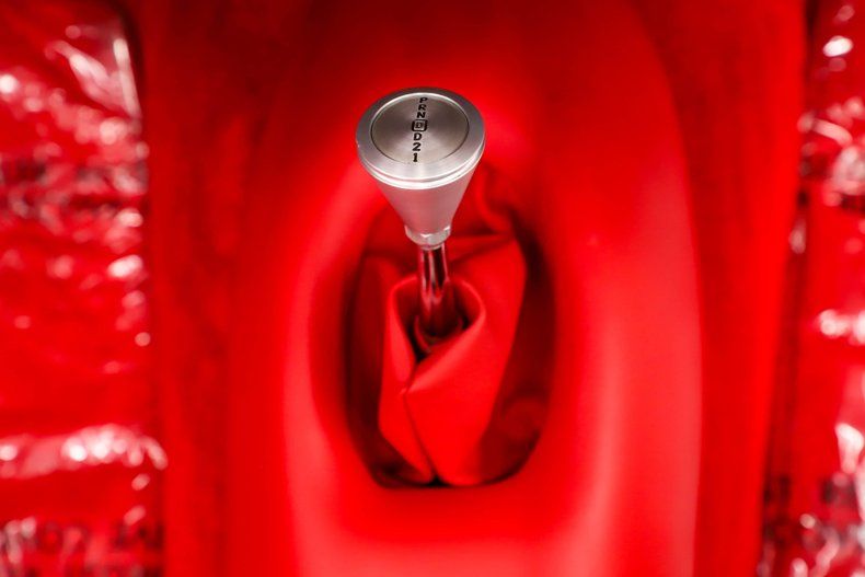 INTERIOR: This red just tickles the senses! Beautiful door panels all molded and upholstered. Smooth clean dash with an integrated LED gauge cluster, ignition, and all the knobs/buttons including climate control for the air conditioning are hidden underneath, this really gives it a modern custom look. The upholstered bucket seats are very comfortable and supportive with ample room for 2 adults. Air ride controls are located on a panel behind the seats for easy access. The center console has built in cruise control switches and a sweet Lokar shifter. The speakers and vents were fabricated into the kick panels and cleans the look up even more. They even have custom made floor mats on top of the plush red carpeting. It wired with a modern blade style fuse panel. The custom billet pedals, and a chrome tilt column with custom billet wheel (that matches the rims perfectly) nicely round off this interior.