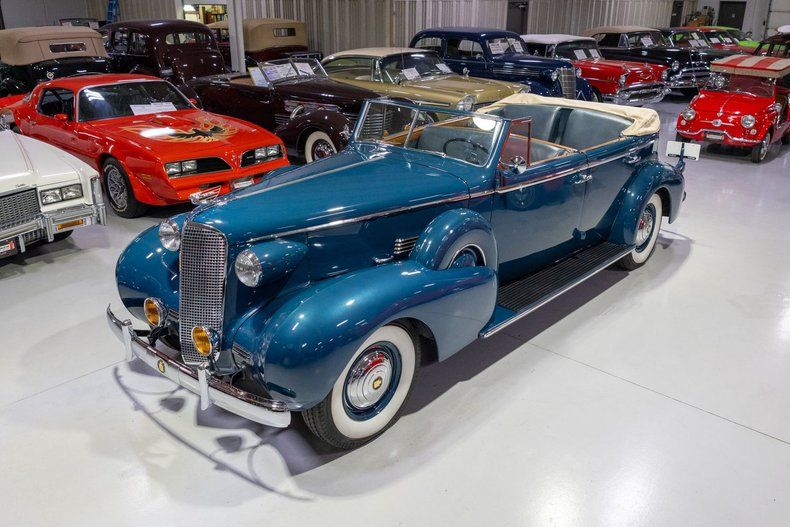This 1937 Cadillac Series 75 Convertible Sedan with Imperial Division is a gorgeous, extensively restored Fleetwood-bodied pre-war divider window-equipped convertible that is ready to be taken on the next Classic Car Club of America CARavan. 1937 was a momentous year for Cadillac, the most premium, most luxurious brand in General Motors portfolio, with the marque nearly doubling its sales from the prior year. Having emerged from the worst financial crisis in American history, the Great Depression, Cadillac was one of only a few surviving luxury automakers with the Depression leading to the demises or imminent demises of many of its contemporaries including Auburn-Cord-Duesenberg, Marmon, Peerless, Stutz, and Pierce-Arrow. To survive, Cadillac, in part, relied on the sales of its less-expensive models and on its less expensive companion brand LaSalle, taking a similar approach to Packard who also was able to survive. While Cadillac was selling less expensive cars during these years, it also kept producing the high-end, long wheelbase, often-chauffeured and ultra-high luxury cars as well, such as its V-12 and V-16 models. The richest of the rich, especially those left unscathed by the Depression, still wanted cars that were luxurious, beautiful, and powerful, however by 1937 fewer of these folks remained and 1937 actually marked the end of Cadillac's V-12. The 1937 Cadillac bodies were largely left unchanged from the previous year and they were still being built by either Fisher or the more prestigious Fleetwood. Of course, Cadillac did make some styling changes to diffentiate its new 1937 models from the previous year. Up front, the most notable update occurred in the grille which was now comprised of a die-cast "Egg Crate" design. The front fenders were also restyled a bit, appearing to come to peak in the center. The front and rear chrome bumpers also underwent a redesign, now featuring a Cadillac Crest in the center. Like virtually all Cadillac produced up until this point, the 1937 Cadillac interiors were extremely plush and luxurious further reinforcing Cadillac's reputation for producing the best cars in the United States. In total, Cadillac produced a mere 4,232 of its premium V8 Series 70 and 75 models across all of the 20+ body styles, which makes this particular Convertible Sedan with its Imperial Division an ultra-rare, pre-war luxury car. Like all Cadillacs of this model year, this 1937 Series 75 has been deemed a Full Classic by the Classic Car Club of America (CCCA) and therefore qualifies for all CCCA events and CARavans should you wish to participate. This particular '37 Cadillac Convertible comes to us from an esteemed owner who carefully and meticulously stewarded this beauty for the majority of the last decade. A 346 Cubic Inch L-Head V8 paired with a Stromberg Single 2 Barrel carburetor propels this incredible pre-war Cadillac down the road with ease and is said to have produced 135 horsepower when new. The 346 V8 is mated to a 3 speed manual transmission that is shifted with a floor mounted shifter, making this '37 Cadillac Convertible a fun and easy car to take on an afternoon cruise. Exhaust exits this Cadillac 75's L-Head power plant via single tailpipe, topped with a chrome exhaust deflector, generating a wonderfully smooth sound from the rear. This 1937 Cadillac Series 75 comes equipped with many desirable upgrades and options! Riding on a set of wide whitewall radial tires mounted on color-matched painted steel wheels and accented with Cadillac encrusted chrome wheel discs, this '37 Series 75 Convertible has an outstanding look and even better ride. Optional dual covered side-mounted spare tires further elevate the upscale appearance of this pre-war luxury convertible. To improve starting and overall drivability, this 1937 Cadillac 75 Convertible Sedan has also been equipped with an electric fuel pump which is a wonderful upgrade to any pre-war automobile. Dual chrome outside mirrors are another welcome addition since they greatly improve visibility, whether you're cruising down the road or trying to squeeze into a tight parking space at the local CCCA car show. The front and rear chrome bumpers have each been outfitted with a pair of chrome bumper guards that both augment the luxurious look of the car and provide for a bit more protection to the bumpers. Mounted above the front bumper are a pair of amber-colored, Cadillac-branded fog lights further improving visibility low light situations should the need arise. Tucked underneath the tan canvas boot is a manually-operated tan cloth convertible top that provides a wonderful contrast to the overall look of the car. The Fleetwood-build body on this 1937 Cadillac Convertible has been correctly refinished in Admiral Blue paint that completes the exterior look of this outstanding example. This 1937 Cadillac Series 75 Fleetwood Convertible Sedan is absolutely stunning! The front and rear bench seats, along with the door panels, seat back, robe cord, and armrests, have all been correctly reupholstered in Blue Imperial Antique Leather and all show particularly well. The front seat back and door panels are also all topped with gorgeous burl wood trim that amplifies the luxurious look and feel of this Cadillac's interior cabin. The rear passenger compartment is wonderfully optioned with a clock, pass-around cigar lighter, dual ash receivers, and a pair of footrest hassocks, and it is separated from the front by an Imperial Division roll-up glass divider window. The driver will be delighted with full instrumentation including a 100 MPH speedometer, temperature gauge, oil pressure gauge, battery gauge, and fuel gauge. The dash is finished off with a full-size clock, locking glovebox, ash receiver, pass-around cigar lighter, throttle control, and even an AM radio. Whether you're buying your very first classic car or you're wanting to add another gorgeous Pre-War classic to your existing collection, this 1937 Cadillac Series 