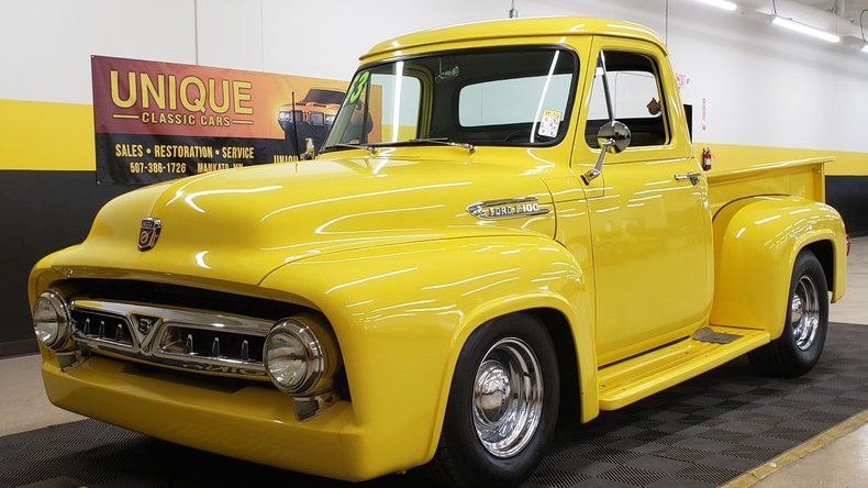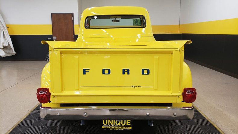 1953 Ford F100 Pickup Street Rod in Yellow paint. 350ci V8 under the hood with a TH350 automatic transmission. Equipped with power steering, Edelbrock 4bbl, and aluminum radiator as well. Steel body truck with fiberglass running boards and rear fenders. Riding on chrome wheels with radial tires. behind the wheel in the passenger wheel well is a battery disconnect switch. Custom gray heather cloth bench seat with custom center console install and radio install. True dual exhaust front to rear. Power tonneau cover in the rear. Aftermarket gauge cluster, tilt column, and power windows. The power window switch has been incorporated into the crank window handles. Stereo works. Truck bed finished nicely with wood and inlays.