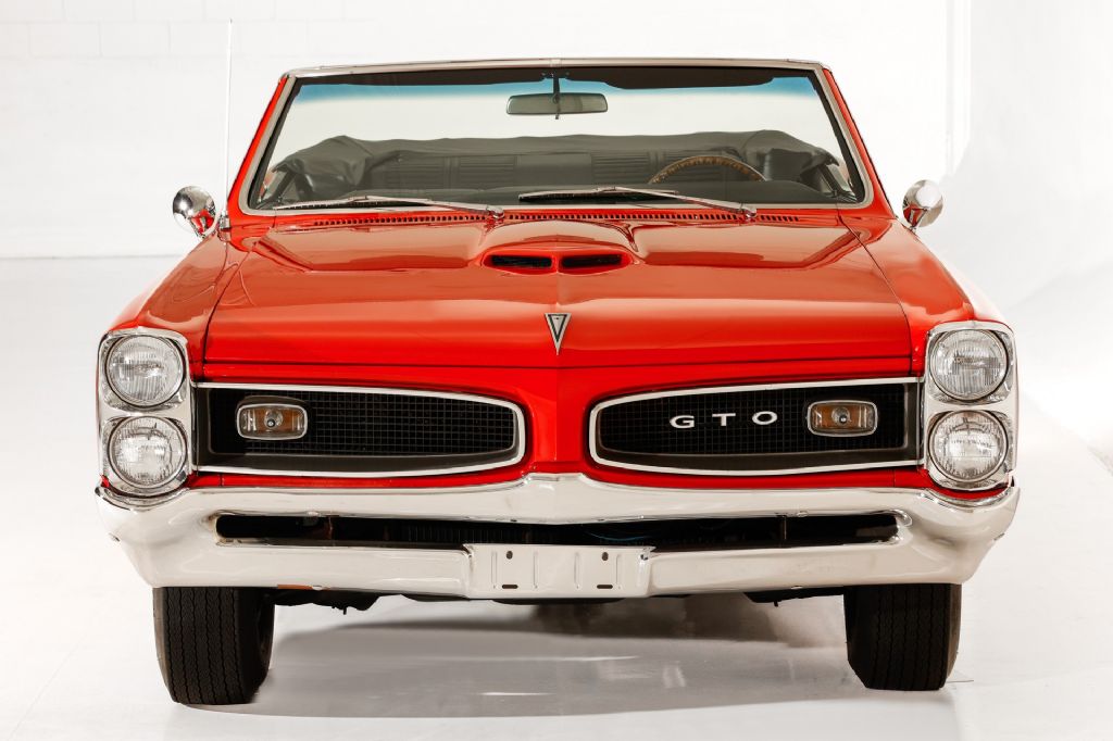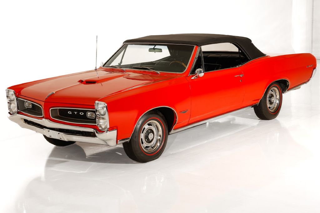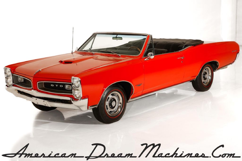 Montero Red 1966 Pontiac GTO convertible, 389 Tri-Power V8, 4-Speed, power steering, power disc brakes, newer black bucket interior, center console and newer black power soft top. According to the previous owner, this ravishing red GTO underwent an extensive restoration and has less than 2500 miles since completed. The project started with an exceptional GTO body with excellent metal structure that has retained its original floors, frame and body panels. The car was professionally painted in Montero red and shows very well with newer bumpers, newer rocker trim and topped off with a newer black soft top. According to the PHS, Pontiac Historical Documentation, this Pontiac is a certified 242 vin numbered GTO convertible and the original factory color factory color was dark Nightwatch blue with fawn interior, which is a striking color combination. The restored black bucket interior is equally as nice with newer black seat upholstery, door panels and carpet, a refurbished instrument cluster with clear crisp gauges and great looking GTO center console that wraps around the 4-speed and after market gauges tucked under the dash to better monitor the engine. The car is rolling on restored Pontiac rally wheels and newer redlines for that investment grade GTO curb appeal.