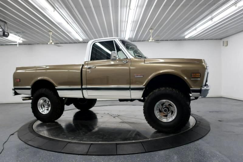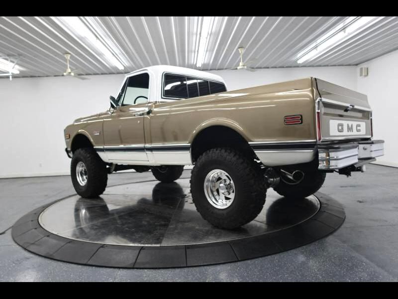 1970 GMC K15 4x4 This beautiful truck features a matching numbers 350 engine a 350 turbo automatic transmission Dena 44 front axle GM 12 Bolt posi rear end 4.11 gears 2 1/2 inch dual exhaust this beautiful truck has been rotisserie restored and You would be hard-pressed to find onenicer this is one gorgeous truck. Power steering power brakes Vintage air-conditioning serpentine pulleys fin valve covers fender air cleaner fiend oil caps aluminum power steering pump dual electric fans scorpion bedliner wood bed floor with stainless slats smoky Road aluminum bed chrome AC compressor chrome water pump chrome alternator chrome serpentine front drive system new process 205 transfer case Dix CPX cross country 3512 5015 tires four-wheel-drive lockout all new interior new seat new carpet new door panels new seal plates rebuilt instrument cluster the list goes on and on and on the chrome stainless and bright work on this truck a second to none this is one gorgeous ride I drove this truck the other day down the road I stopped a couple places people fell in love with this truck it is original two tone paint scheme and the GMCs are hard to find this is a gorgeous truck dont miss your opportunity to own it Give us a call today and let us bring it from our show room to your garage!