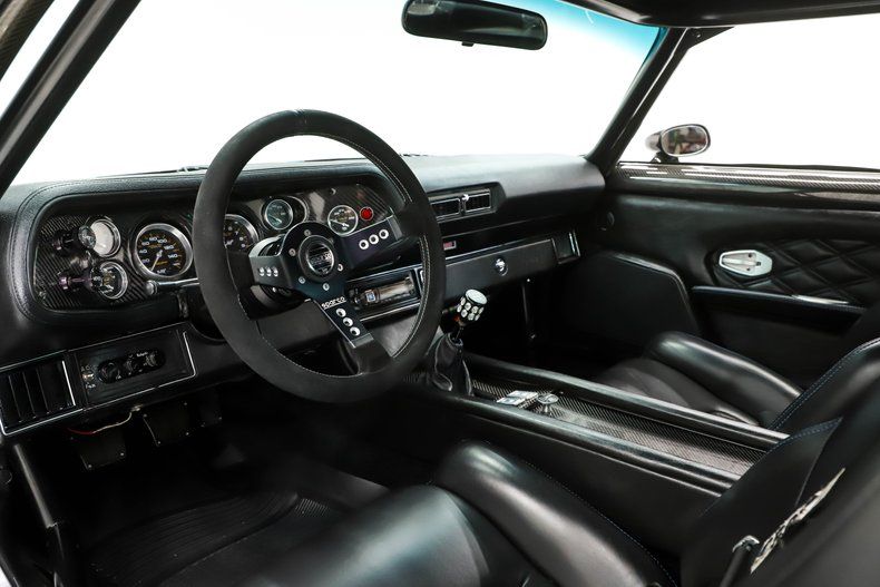 INTERIOR: Custom interior with blue accent stitching! The sports seats have tremendous support plus the 4 point racing harnesses to help keep you in place and safe. The rear bucket seats are upholstered to match. There is a full length custom center console with built in storage, cup holders, charging ports, power window switches, and the 6 speed manual shifter. The custom door panels match the seats and have billet handles, carbon fiber trim, and integrated speakers. The headliner and carpeting were both replaced. The dash pad is in great shape, and the dash itself has a carbon fiber gauge bezel and Vintage Air climate controls neatly integrated. An array of Autometer Carbon Fiber Ultra-Lite gauges monitor all the vitals. The 7 speed wipers are a nice practical upgrade. The Bluetooth capable Alpine head unit is linked to Focal speakers and 10" subwoofers. Detroit Speed roll cage is more than a safety feature, it makes the car that much more rigid and improves the handling. This one has the low side bars which makes it extremely easy to get in and out plus a quick release rear bar if you need passengers in back. The pedals are upgraded with nice aluminum units, and it has a tilt column. The Alcatara wrapped Sparco quick release steering wheel is just as practical as it is pretty.