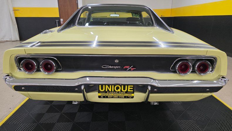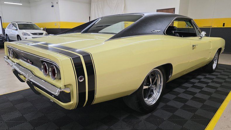 1968 Dodge Charger resto-mod, blending classic styling with modern performance enhancements. At its heart is a fuel-injected Mopar Performance Mega Block V8 engine paired with a 4L85E automatic overdrive transmission, featuring a Hughes performance bell housing and torque converter. The restoration includes significant suspension upgrades such as a Riley Motorsports coilover system upfront and a Riley Street Links triangulated four-link coilover setup in the rear, mounted on a Dana 60 axle. Stopping power is boosted by Wilwood disc brakes on all four wheels, complemented by dual exhaust with Flowmaster mufflers and custom headers for optimal performance and sound. Yellow paint with a black vinyl interior. Riding on 18 inch Magnum 500 style wheels with a modern polished and black two-tone finish. Some minor touch-ups are evident but overall, the body panels are straight and well-maintained. This car has plenty of power to no end and is fun to drive! We did notice the car does have a shake in the front end around 55mph and the seller has elected to sell the car with that announcement. Inside, the black vinyl bucket seats show no major wear, and the dashboard retains a mostly stock look with functional gauges including an aftermarket AC control, water temperature gauge, tachometer, and a working clock. While the air conditioning compressor operates quietly, it does not blow cold air. Iconic 1968 Dodge Charger grille with hideaway headlights, and hood turn signal indicators. On the road smooth automatic shifting, and responsive throttle.