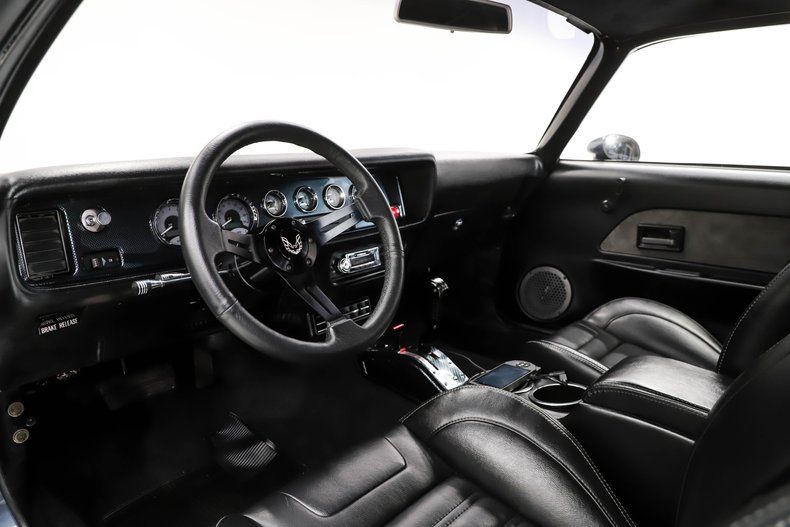 EXTERIOR: Someone made all the right choices with this car; I love the finished look. The stance is great, the color is amazing, the body work is outstanding with laser straight panels that line up beautifully. It has the fiberglass dual scooped formula hood with custom cowl inserts. A smokey grey blue metallic paint was applied and polished like glass. The trim and grilles have been painted a satin gray which accents the exterior paint wonderfully. The rear bumper is color matched to the car. The smoked glass has all been replaced, plus the weatherstrips and seals too. Upgraded LED headlights and it's sitting on a set of beautiful 18" Riddler wheels wrapped in performance tires.