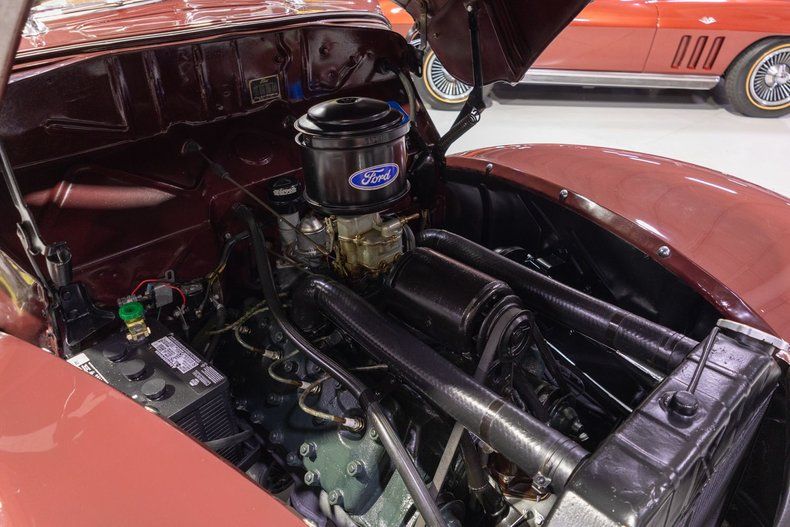This 1940 Ford Deluxe Convertible Coupe is a beautifully restored, V8 Ford with great options and Art Deco flair! Debuting in dealer showrooms in October of 1939, it was clear that the 1940 Ford models were the style leader for its price class. Carrying forward the teardrop design elements from the previous year, the Eugene Gregorie designed '40 Fords were (and continue to be) absolutely gorgeous and many believe that Edsel Ford himself even played a major role in sculpting the Art Deco inspired design. The iconic design of the 1940 Ford was an outstanding refresh from the previous year and this was clear from nearly every angle. Up front, the new-look grille was a major highlight but perhaps the biggest improvement was made to headlights that were trimmed in chrome and tastefully incorporated into the front fenders, and now featured sealed beam headlights which was a first for Ford. The side profile of the 1940 Ford was equally beautiful with curvy front and rear fenders along with nice clean body lines and neat trim. In the rear, the chrome taillights and bumpers were absolutely gorgeous and on the coupe models, the sloping body lines capped off an outstanding looking, streamlined design. For the interior, the 1940 Fords were highly trimmed especially for a car in its class and the biggest update was Ford's shift away from a floor mounted shifter to the more modern column-mounted "Finger Tip Gearshift" that also made the interiors more roomy. The other major update for Ford in 1940 was the addition of the modern Convertible Coupe body style complete with a vacuum-powered convertible top that was touted as raising and lowering "automatically" via a vacuum-controlled switch. In total, Ford produced 23,704 Convertible Coupe models which comprised a less than 4% of Ford's total production in 1940 which makes this particular car quite a rare one and even more rare since it does not appear to have been modified as many '40 Fords have been over the past 85 years. Under the hood on this '40 Ford Convertible is a 221 cubic inch Ford Flathead V8 engine fed by a single 2 barrel carburetor that together were said to have produced 85 horsepower when new. The 221 Flathead V8 is backed by a 3 speed manual transmission that is shifted using the column-mounted "3 on the tree" shifter known as a "Finger Tip Gearshift." Exhaust exits this 1940 Ford DeLuxe via a single exhaust port that generates a terrific throaty sound out of the rear tailpipe. This 1940 V8-powered Ford Convertible comes absolutely loaded with options! Riding on a set of wide whitewall tires mounted on painted steel wheels and accented with Ford Deluxe emblazoned chrome hubcaps and chrome beauty rings, this '40 Ford has an outstanding look whether you're showing it at the local car show or you're cruising down the road. Further elevating the gorgeous look of this Ford Convertible is a matching set of rear-mounted fender skirts with the rear wheels tucked behind. The front and rear chrome bumpers are also outfitted with optional chrome bumper guards that also give this pre-war Ford an upgraded upscale look. Dual chrome outside mirrors are another wonderful addition to this classic Ford since they greatly assist when trying to squeeze in and out of a tight parking spot at the local drive-in or car show. The white cloth power convertible top is raised and lowered with ease with flick of a switch and is powered by a novel vacuum-powered system. The chrome and brightwork around the exterior of this classy Ford Convertible looks great as well! The all steel body of this 1940 Ford Deluxe has been refinished in a beautiful Mandarin Maroon paint that completes the exterior appearance of this Art Deco inspired convertible. The interior of this 1940 Ford DeLuxe Convertible Coupe is absolutely gorgeous! The front and rear bench seats have been reupholstered in Caramel upholstery that provides a wonderful contrast to the exterior look of the car. The color-matched upholstered door panels, rubber floor mat, beige carpeting, painted dash, and two-tone steering wheel all look great and remain in their stock configuration. The interior is also highly optioned with a rear view mirror, color-matched upholstered sun visors, and heater that is tucked neatly under the dash. Additionally, this 1940 Ford DeLuxe Convertible comes equipped with full instrumentation including a 100 MPH speedometer, oil pressure gauge, battery gauge, temperature gauge, and fuel gauge. The dash is finished off with a locking glovebox, clock, cigar lighter, and even an AM radio. Whether you're buying your very first classic car or you're adding to your existing FoMoCo collection, this 1940 Ford DeLuxe Convertible Coupe would make an excellent choice. Give Ellingson's a call today at 763-428-7337!