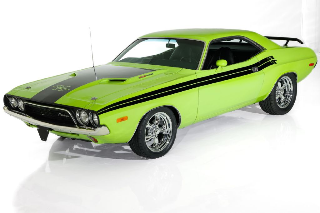 This mean Sublime Green 1972 Rally Challenger Street Beast is built to burn rubber with a 392 Hemi power plant, topped off with dual quad carburetors, Hemi RT options, graphics and badging. This Sublime green Rally Challenger is packing a massive rebuilt 392 Hemi engine under the hood a is launch into high gear with a 727 automatic transmission and slapstick shifter, disc brakes to control the power and backed up by a heavy duty posi-traction rear end. The black bucket seat interior is in exceptional condition with center console, wood accents and Rally gauges. This Mopar street beast is rolling on brand new American Racing chrome 5 spoke wheels and new performance radials to put the rubber to the road. These can be exchanged if you prefer the stock look.