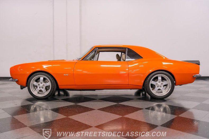 Sunburst Orange Metallic coats every inch of this fully customized 1967 Chevrolet Camaro Restomod, making it a vibrant icon of American muscle gone modern. Built with a tasteful Super Sport hood, front and rear spoilers, deleted side mirrors, and shaved door handles for a cleaner appearance, this Camaro displays custom craftsmanship in every curve. The aggressive stance comes courtesy of SpeedTech tubular upper control arms, while the 18" Bonspeed wheels wrapped in BFG rubber (235/40ZR18 front and 275/40ZR18 rear) anchor this beast firmly to the ground. The shaved drip rails gives this Camaro a sleek, custom profile unlike anything else on the road.
