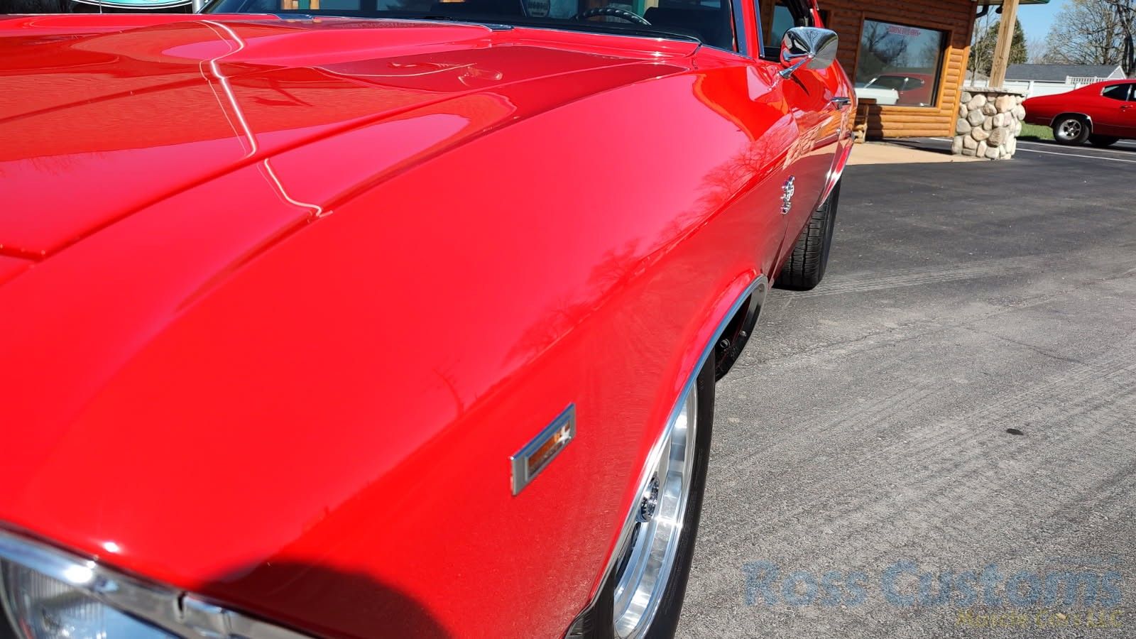This is a very nice 69 Chevelle 396 4 speed that has had a recent restoration, starting out with a very clean car, done in "Show Quality" Torch Red, basecoat clearcoat, sanded and wheeled smooth, at time of restoration had new tinted windshield; all other glass is factory original softray tint in excellent condition, window stainless and drip rail moldings are original in excellent condition, new weather stripping and window felts, new door handles, new side view mirrors, new emblems, new headlight bezels and grill moldings, grill looks like new, original front bumper in excellent condition for its age, new wheel well moldings, taillight bezels appear to be original in excellent condition, new tail panel moldings, original rear bumper - does show some age.