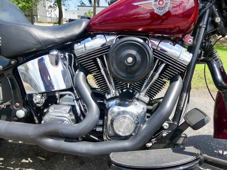 Survivor Classic Car Services of Tampa is proud to present this sweet 2001 Harley Davidson Fat Boy motorcycle! This HD FLSTF is a clean bike that is an absolute pleasure to ride. The rich red paint looks great on its own but really shines in contrast to the black accents throughout the bike. Saddle bags and a small windshield give you some of the bagger convenience without having to deal with such a large bike. Or take them off for a cleaner more streamlined look. We show it both ways in the photos.