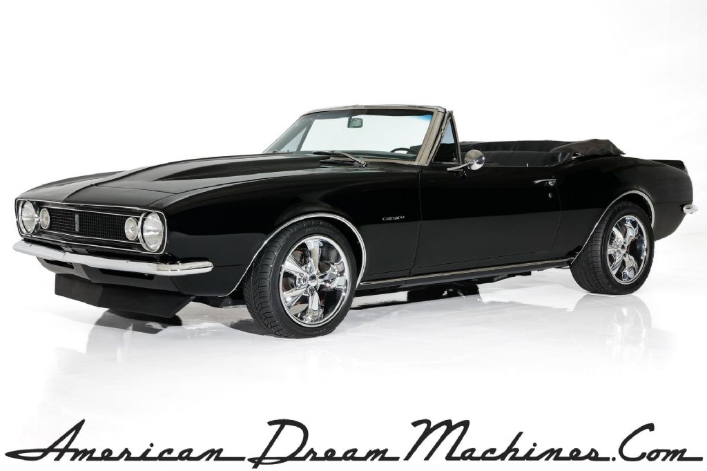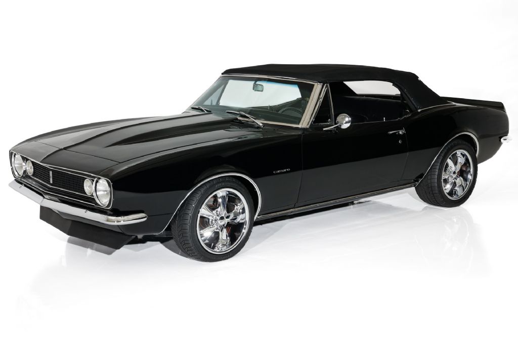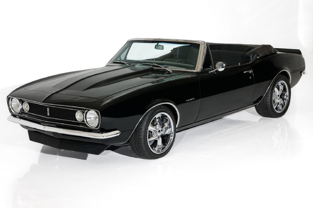 Triple Black 1967 Pro-Tour Camaro convertible, Frame-off restored and loaded with power and performance options. Frame off restored with mirror finish jet black paint over a structurally beautiful metal body. Check out the undercarriage. It's amazing. Under the cowl hood showcases a 350 crate engine jeweled with show chrome and topped off with Fitech fuel injection, aluminum heads and chrome Chevrolet valve covers. This black beauty is loaded with power and performance options, including chrome serpentine belt system, chrome power steering, chrome power booster and newer front disc brakes and chrome Vintage air conditioning and an aluminum radiator to keep the engine cool. The black bucket interior is equally as nice newer black bucket seats and center console and factory styled 3-speed shifter on the floor and topped off with a newer heavy duty black cloth soft top. This jet black street beast is launched 350 Turbo Hydra-Matic 3-speed transmission and rolling on Foose chrome and performance rated radials for that Pro-Tour look.