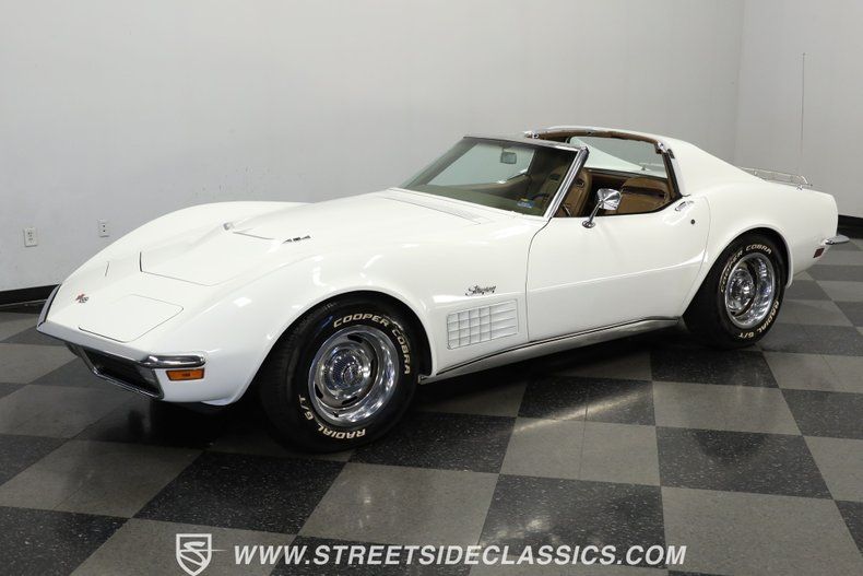 Numbers-matching components verify authenticity on this 1971 Chevrolet Corvette LS5 454 finished in Classic White paint across its fiberglass body. Chrome bumpers front and rear maintain their original luster while the removable T-tops add versatility to the coupe configuration. Rolling on 15-inch chrome wheels wrapped in 225/70R15 tires, the stance remains true to its factory specifications. All exterior trim and badging present well, with glass and lighting elements remaining clear and functional throughout.
