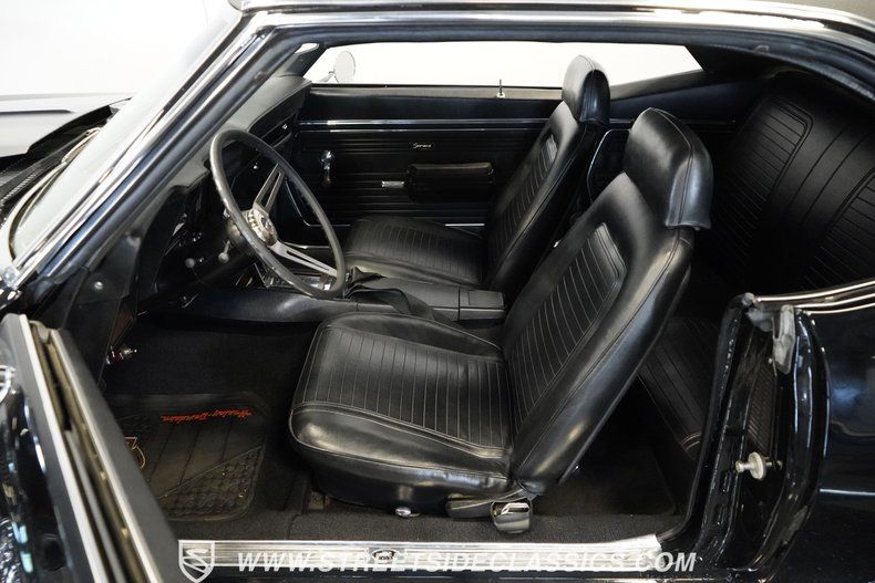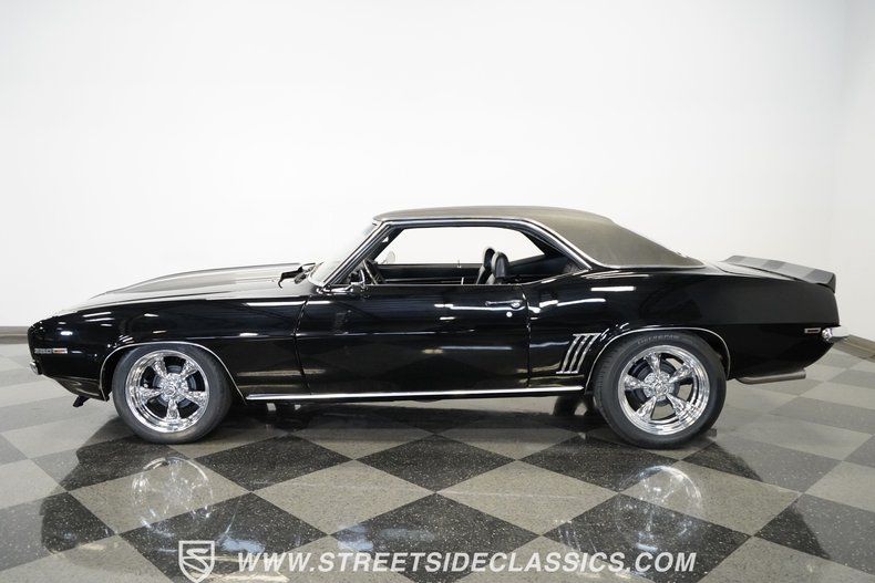 Powerful and menacing, the 1969 Chevrolet Camaro RS wears a sleek black exterior accented by dual gray stripes that run from front to back. Showing an incredibly low 71,392 actual miles, this triple-black machine features unique RS styling with distinctive headlight louvers in the grille, an RS decklid badge, strategically placed fog lights, and an athletic chin spoiler. A mild cowl hood adds visual punch while the small rear spoiler completes the look. Chrome American Racing wheels in staggered 17/18-inch sizes fill the wheel wells perfectly against the black paint.