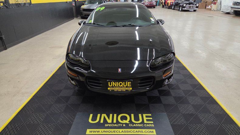 1999 Chevrolet Camaro Z28 coupe available at Unique Classic Cars, showcasing the vehicle's features, condition, and driving experience. It highlights the car's provenance, being a two-owner vehicle with a clean Carfax and genuine mileage. Powered by a 5.7L LS V8 engine mated to a six-speed manual transmission, the Camaro presents an engaging sports car experience. There are minor paint imperfections, tinted headlights and glass, dual exhaust system, and an indent on the drivers side front fascia. The engine bay is clean and well-maintained, and the overall presentation of the vehicle reflects a sporty, aggressive blacked-out theme enhanced by factory chrome wheels. On the road the Camaro's acceleration is very good, with smooth operation of the manual gearbox, comfortable cruising at freeway speeds thanks to low RPM in sixth gear, and enjoyable throttle response!