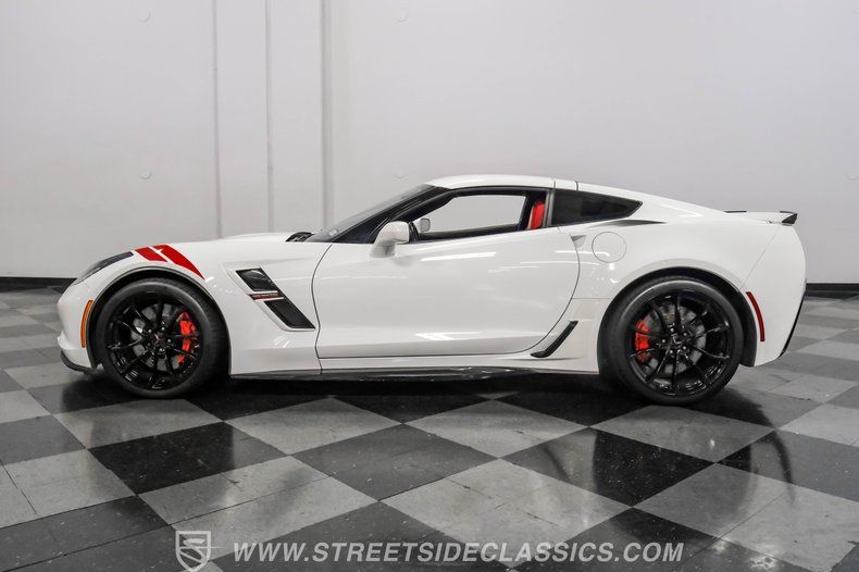 One owner from new, this 2019 Chevrolet Corvette Grand Sport 2LT features Arctic White paint with red hash mark decals on the front fenders. Staggered wheel configuration includes 19-inch fronts and 20-inch rears wrapped in 285/30ZR19 front and 335/25ZR20 rear Michelins. The targa top design allows for open-air motoring when conditions permit. Grand Sport package adds specific exterior elements while the 2LT trim level includes premium appointments throughout.