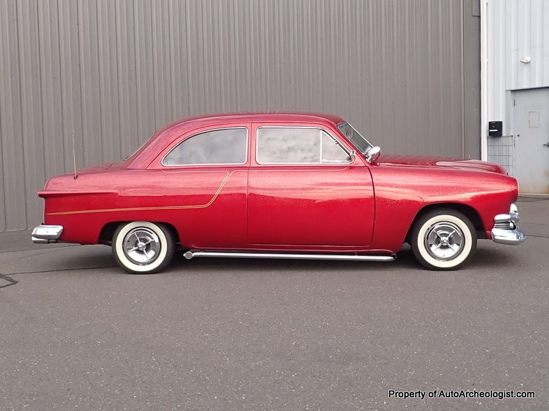 Frenched headlights and tail lights. The headlights are halogen, the tail lights from a 49 Ford. Corvette grill inset, shaved door handles, hood and trunk, and frenched rear antenna, 1957 Dodge Royal Lancer hubcaps, Jaguar rack and pinion, Chevy 350, Powerglide auto trans, leather button tuck and tuck and roll upholstery, vinyl headliner, electronic trunk release, blue dots, electric wipers, rolled wheel wells, turnpike cruiser skirts, tilt wheel (also from a Chevy), dash pinstriping, dummy spotlights and lake pipes, one piece side windows, Lokar floor shifter, fully upholstered trunk and of course, the gold flake paint that has more gold in it than a western mining town.