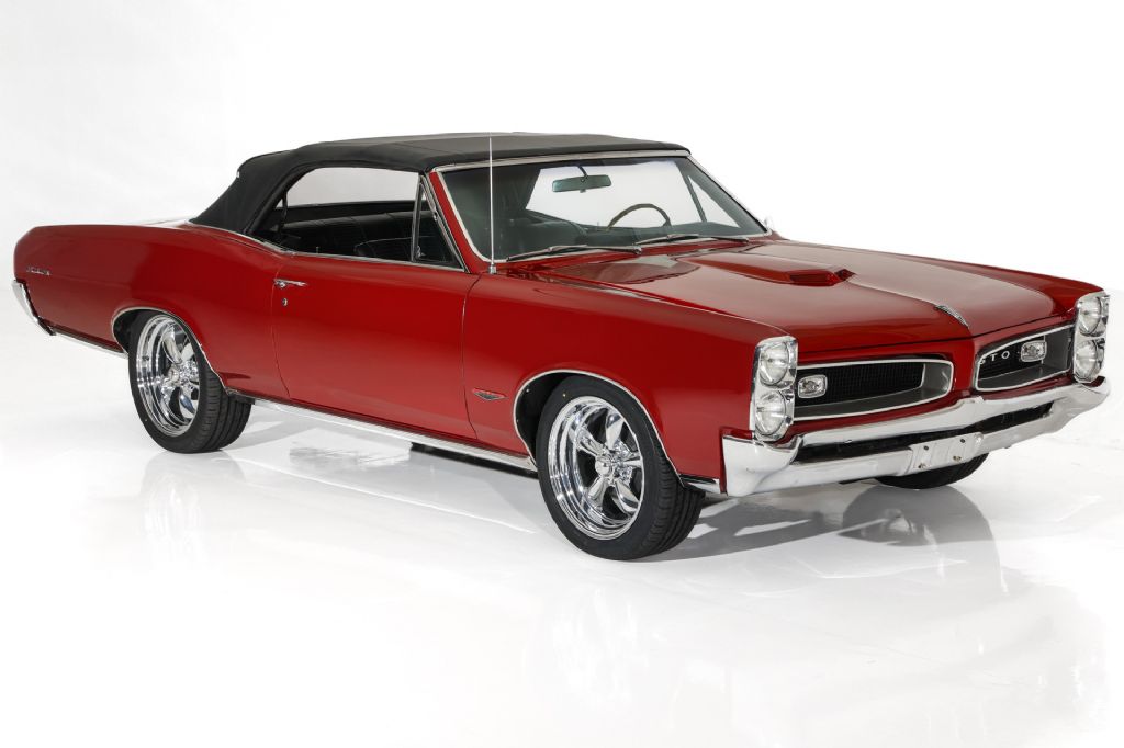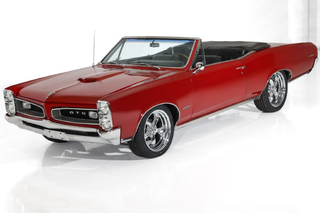Beautiful Montero Red Pontiac GTO convertible with newer black bucket seat interior with console and black power top, documented by PHS Pontiac Historical Society and its 242 GTO vin number. Under the hood of this Arizona born GTO is a rebuilt 400 engine topped off with a Rochester Tri-Power, three deuces carburetor system, nicely optioned with power brakes, power steering and heavy duty Turbo 400 3-speed automatic transmission that shifts beautifully. Meticulously maintained and professionally serviced by the previous owner since 2013. According to the PHS this car was an original 4-speed GTO and it may still be available from the previous owner for a a price. The original color was candlelight Cream with black top and black interior. The black bucket seat interior has a full size center console, that is very nice with newer black seat covers, with an exceptionally nice wood grain dash with clear crisp tach and gauges, tilt steering column and matching GTO wood wheel. New professionally installed dual exhaust with Magna Flow stainless mufflers and chrome tips that sounds amazing. This American Dream Machine is rolling on brand new American Racing 18 and 20 inch chrome Torque Thrust II wheels and new performance rated radials that will put the rubber to the road. These wheels can be exchanged for the classic Pontiac Rally II wheels and redlines, if you prefer the stock look.