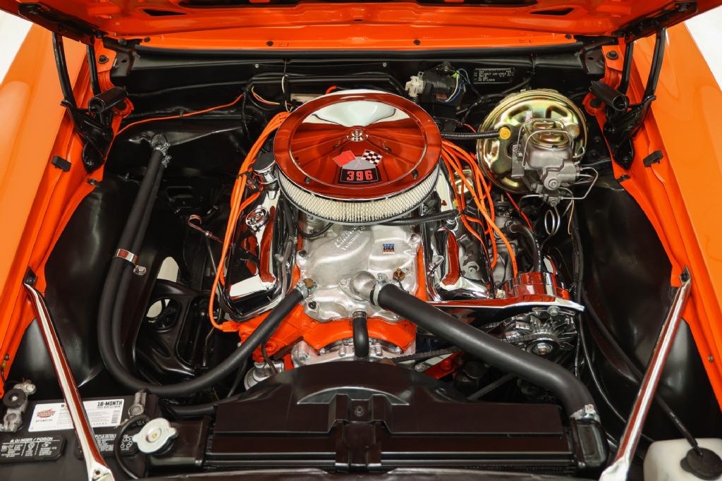 Authentic SS 396 Chevrolet Camaro, launched by a 396 big block engine and a Muncie 4-speed transmission, and backed by a 12-bolt posi-traction rear end. This true SS is validated by the 4N on the cowl tag. This incredible SS Camaro came from the factory with special order, Code-O and has been painted in bright Hugger Orange which was not available in 1967 and has a black SS nose stripe and correct SS 396 hood, options and badging and has been upgraded with Detroit Speed electric, Rally Sport, hidden headlights that open faster than the original vacuum style. Factory correct code- 765 deluxe black custom interior with white SS sport stripe, factory center console with tach and gauges, Hurst shifter, Retro sound radio and original RS steering wheel. The dual Flowmaster exhaust sounds like a true muscle car. Currently rolling on new US Mags Rambler, chrome wheels and new performance rated radials that give this Camaro a wicked stance. Other factory correct wheel options available.