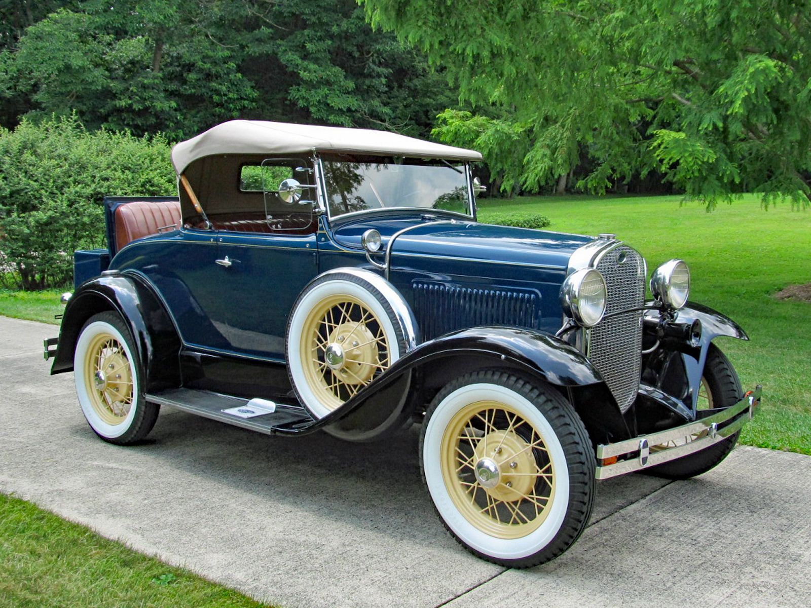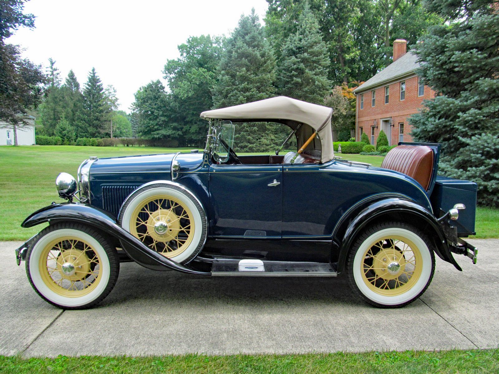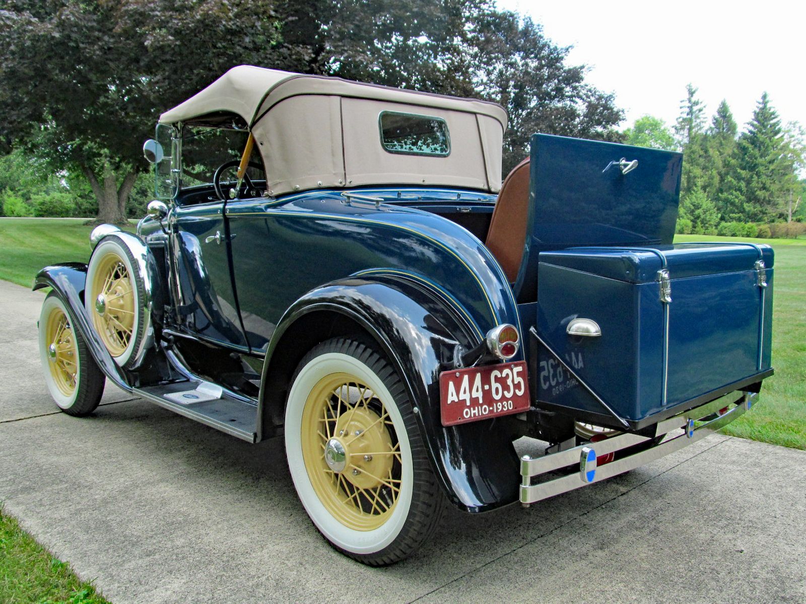 1930 Ford Model A Deluxe Roadster Convertible with Dual Sidemounts and Rumble Seat. Call Pete or Andy 419-668-1884. Excellent. Off Frame Restored. Recent mechanical service including engine rebuild with receipts. Detailed Chassis. All Steel. Finished in Washington Blue and Riviera Blue with Straw pinstripe and wheels. Brown Leatherette interior. Tan Cloth Convertible top. Powered by Ford’s 200 cubic Inch Flathead 4-cylinder engine. Electric Start. Four Speed Synchronized Manual Transmission. This Roadster is equipped with lots of great options and accessories. Stone Guard. Vacuum Windshield Wiper. Cowl Lamps. Dual Sidemounts with Metal Trim Rings. Ford Script Step Plates. Driver Side Mirror. Passenger Side Mirror. Rumble Seat. Trunk. Shocks. Firestone Wide White Wall tires. Turn Signals and Seat Belts have been added for modern touring. Excellent Road Manners. Ready to Drive, Show and Enjoy. Call Pete or Andy 419-668-1884 BE SURE TO WATCH THE VIDEO!