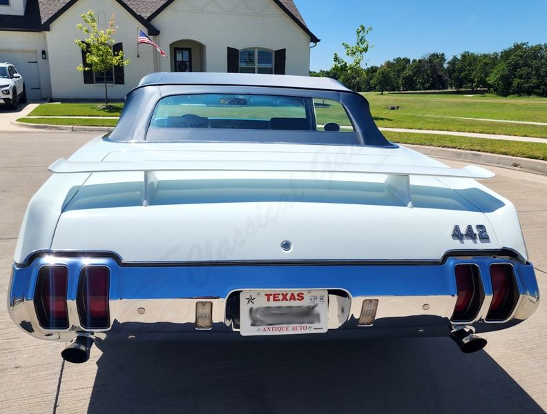 The legendary 442 was introduced by Oldsmobile in 1964 and was produced until 1987. It was originally released as an option package but later became its own model. The name 4-4-2 was applied to the car drawing inspiration from its 4 barrel carburetor, 4 speed manual transmission, and dual exhaust. The badging was eventually shortened and the hyphens removed when it became its own model. This 1970 belongs to the second generation and this year was considered the pinnacle of Oldsmobile performance. To keep up with the horsepower arms race, GM dropped the cap on engine size so Oldsmobile responded with the Olds 455. This year is easily identified by the vertical bars in the grill framed by double headlights and the vertical double taillights in the rear bumper. All of that is in place on the car and in excellent condition. It was purchased by the current owner in 2009 in Texas before undergoing a complete, high end ground up restoration. The build was fully documented and the result is one of the nicest 442s in the country. The body is rust free and in excellent condition. It is painted in the very unique Porcelain White with Blue hood and side stripes. These are its factory colors and is a rare combination. This is then paired with a new Blue power convertible top. The car is very eye catching especially when you get out in the sun. All of the factory chrome is in place and shining bright. It has the original deck lid spoiler in rear with the ram air hood upfront. The car sits on Rocket Racing Wheels with Firestone Wide Oval tires but does come with a full set of the original painted wheels, including a spare should someone want to make it 100% original.