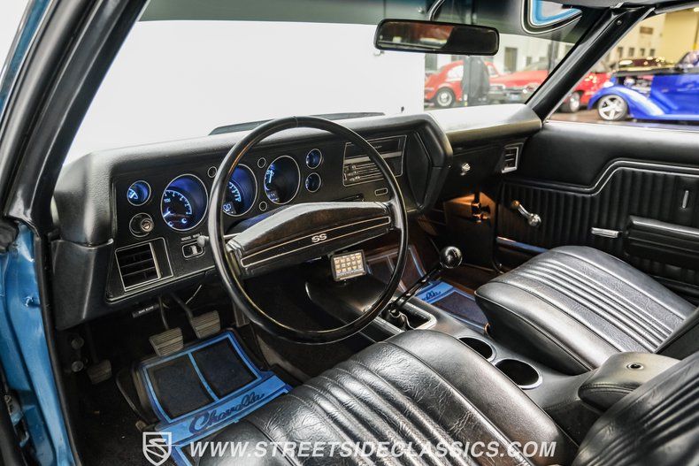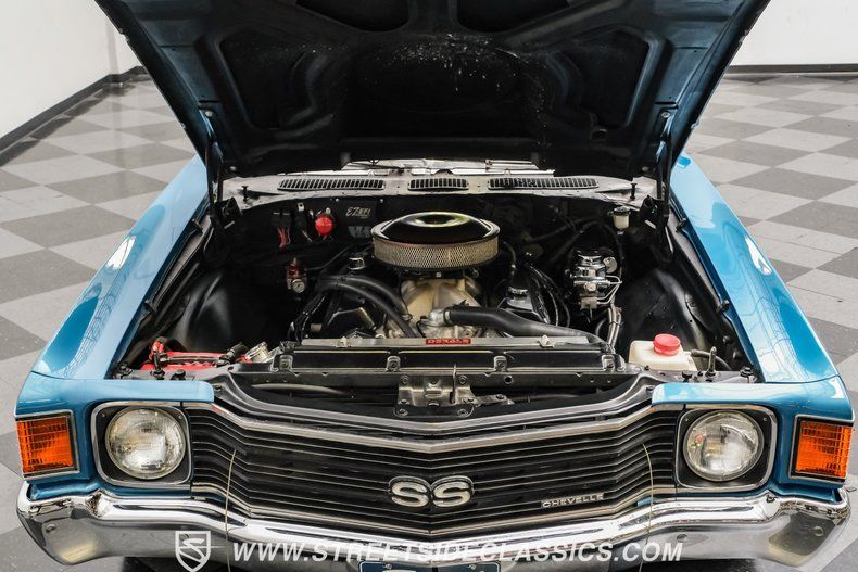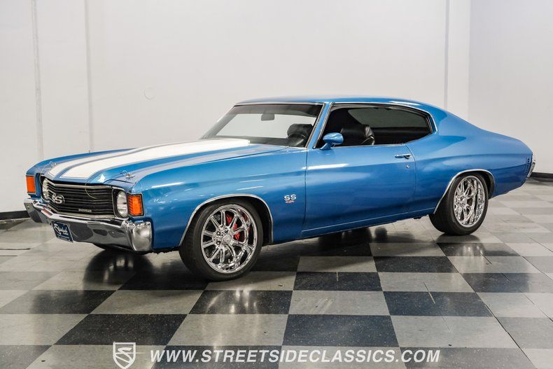 Restomod construction puts modern performance into classic muscle car styling, and this 1972 Chevrolet Chevelle SS 454 Tribute Restomod demonstrates exactly how it should be done. Mulsanne Blue paint covers the steel body with white painted racing stripes running down the center. Chrome bumpers bracket both ends while 18" U. S. Mags wheels sit at all four corners wrapped in 235/40ZR18 Sumitomo tires up front and 275/40ZR18 Sumitomo rubber out back.