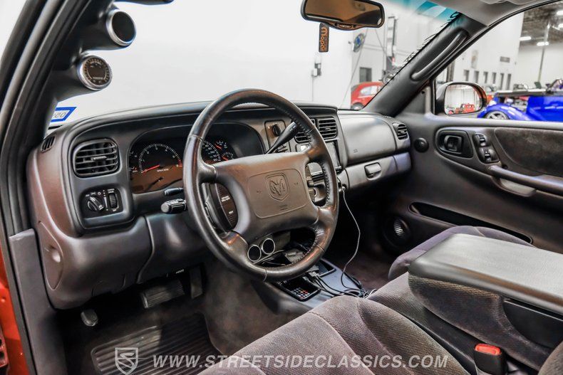 Factory R/T performance meets serious aftermarket muscle in this 2000 Dodge Dakota R/T Supercharged finished in Amber Fire Pearl Coat paint. Black decal stripes accent the custom cowl hood while 19" CCW wheels wrapped in 275/40ZR19 Nitto tires plant this pickup firmly on the pavement. Upgraded headlights, aftermarket tail lights, and a custom rear roll pan with integrated quad-tip exhaust complete the aggressive exterior modifications. A locking tonneau cover protects the short bed while slightly tinted windows add privacy to this unique truck.
