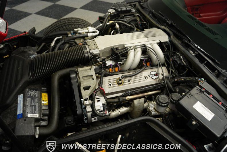 Inside, we find a striking original red leather interior. Featuring a pair of plush and supportive power bucket seats separated by a full-length black center console, complete with dual cupholders and storage compartment armrest. A padded four-spoke wheel sits in front of the signature C4 gauge cluster, centered around a digital speedometer, with an analog 6,000 rpm tachometer and four auxiliary gauges flanking it on either side. The orange backlit digital theme is continued with the HVAC controls and the AM/FM/CD/Cassette head unit, both of which utilize easy-to-use push buttons. Power locks, windows, and mirrors, combined with air conditioning and cruise control, offer a range of modern amenities.