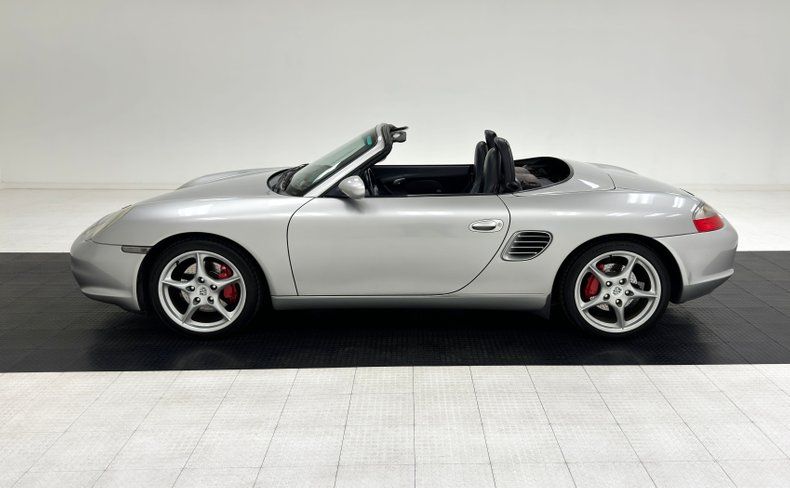 You can't go wrong with Arctic Silver Metallic, and it looks great on this car. The simple front fascia has two straked intake openings flanking a central grille below a smooth bumper and 996 era headlights. The fenders rise above the hood slightly and create a shoulder line that flows to the rear, finally waterfalling into flush mounted tail lights, another smooth bumper, and the now epic center exit exhaust. Like the 550, the cab is short, and this one is shaded by a matching hardtop in excellent shape. The canvas top was removed but comes with the car. The front windshield is steeply raked and the brake cooling ducts in the rear quarter panel are wonderfully integrated into the design. The Boxster emblem on the back is blackened and the 18-inch Porsche wheels look great in front of red calipers and wearing newer 40 series Z rated tires. Minor imperfections include a gash low on the body behind a wheel, a touched up scratch, and the usual scrapes under the chin.