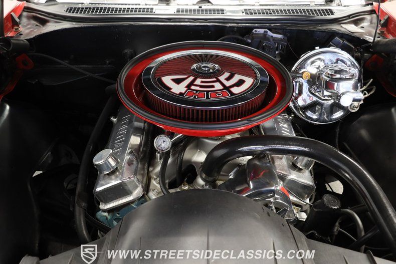 A massive 455 cubic inch V8 engine sends power through the TH400 3-speed automatic transmission. High-rise Edelbrock intake manifold coupled with polished exhaust headers allows this big block to breathe deep. QA1 suspension components give superior handling when attacking corners while maintaining street manners on rougher roads. Power steering and power front disc brakes keep everything controlled. The FlowMaster dual exhaust system with long tube manifolds produces a deep, aggressive exhaust note.