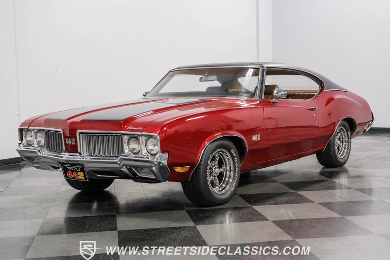 Often considered one of the high points in the muscle car era, and even more so for Oldsmobile, the 442 stands proudly as a flagship car for the Golden Age of high-horsepower vehicles. This particular 1970 Oldsmobile Cutlass 442 has an older repaint in a captivating shade of burgundy, complemented by its matching black hardtop and matching black hood stripes. Thanks to its streamlined Holiday Hardtop design, this awesome Olds look aggressive from any angle.