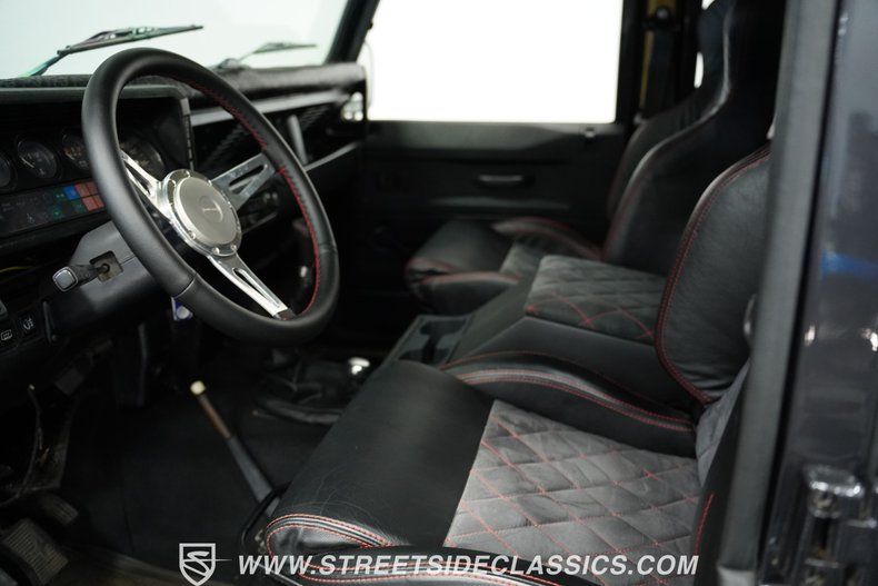 This 1989 Land Rover Santana 110 4x4 is made for toughness. It has been repainted in Charcoal Gray, a color that looks great on a rough-and-tumble truck like this. The aftermarket Defender front bumper pairs well with the heavy-duty rockers and fender extensions. The rear bumper also appears aftermarket and hardcore, complete with a trailer hitch. The Defender Land Rover wheels are in good shape-the black-painted look complements the truck's "Bad To The Bone" theme-and a full-sized spare is attached to the back end. Fold-down step sides make it easier to get in and out of the Land Rover, and the roof rack on top leaves you plenty of options for hauling cargo.