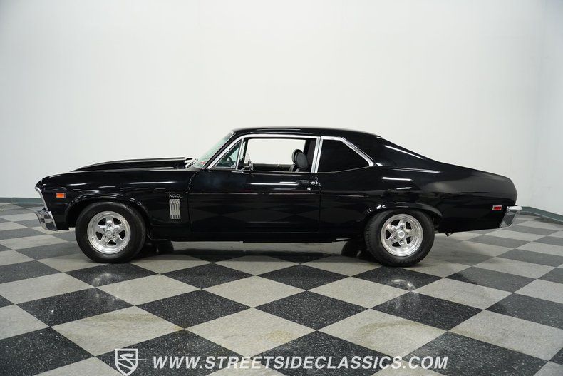 This Jet Black 1969 Chevrolet Nova SS Tribute is one amazing-looking prostreet cruiser. As chrome always does, it looks great on black and shines perfectly on this muscle car. The racing wheels and cowl induction hood make this ride look like it's ready for a little more than a cruise. The tinted windows add to that mysterious look of being up to no good, and although hardly noticeable, the exhaust tips stick out just enough to finish off the sophisticated look.