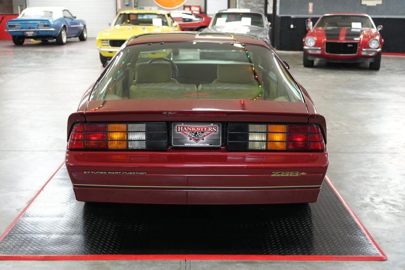 This 1987 Chevrolet Camaro IROC-Z blends iconic 80s styling with V8 performance. Powered by a 5.7L TPI Small Block Chevy V8 paired to a 700-R4 automatic transmission and a 3.27 POSI rear end, it delivers strong performance and cruising comfort. Features include T-tops, air conditioning, power steering, power brakes, and 4-wheel disc brakes for confident handling. The car sports 16" OEM IROC-Z 5-spoke wheels wrapped in Goodyear Eagle HP tires and a striking burgundy exterior paint over a rare tan and brown leather/cloth interior. Equipped with dual electric cooling fans, this IROC-Z is a true collector's piece.