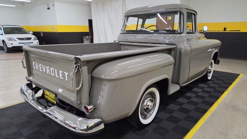 1955 Chevrolet 3100 pickup truck. A Gray-taupe color that stands out while maintaining era authenticity. 235 cubic inch inline six-cylinder engine paired with a three-speed manual transmission operated via a column shift. "3-on-the-tree." Notably, it features a Fenton dual carb intake manifold and a split dual exhaust manifold, providing a distinctive engine sound and performance character. Bright accents, including headlight surrounds, grille, bumper, and a Chevrolet hood ornament. The truck rides on steel wheels painted to match the body, accented with Chevrolet center caps, beauty rings, and wide whitewall radial tires. Minor paint imperfections are present but do not detract from the truck's overall condition. Inside the cab are painted door panels, rubber flooring, and the dash is painted to match the exterior, featuring a stock gauge cluster. Mechanically, the truck is well-maintained, with newer brakes. Minor issues include a slight seep in the left front wheel cylinder and some third gear noise, but overall, it runs smoothly with a quiet idle. The truck is equipped with a receiver hitch for towing small trailers and has a large wraparound rear window. On the road handling, steering, braking, and driving feel are very good. The truck performs well, with smooth power delivery.