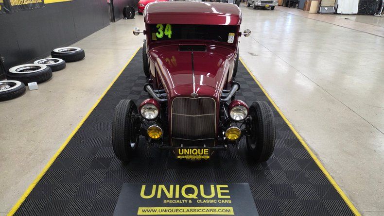 1934 Ford street rod pickup with deep Merlot metallic paint and all-steel body.