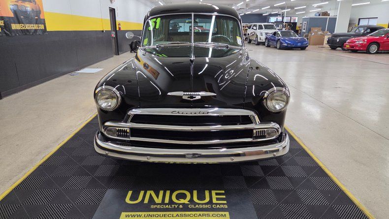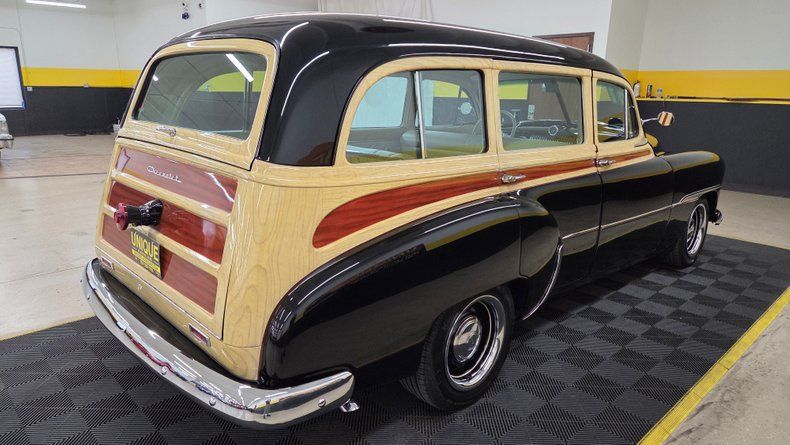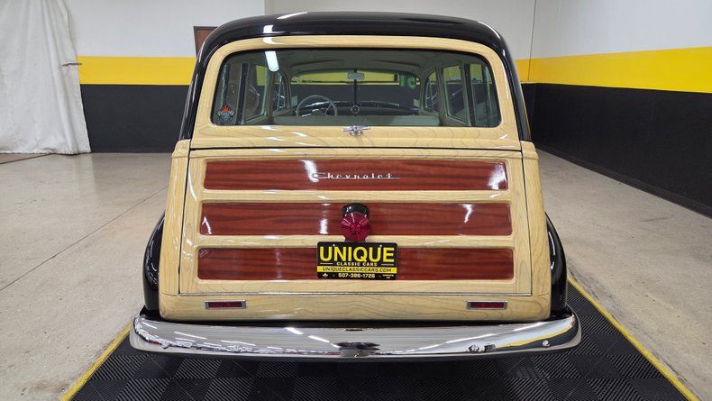 1951 Chevrolet Deluxe Tin Woody wagon. Frame-off restored and featuring a stroked 383 cubic inch V8 engine producing 425 horsepower, paired with a 700 R4 automatic transmission equipped with overdrive. The rear end is a 10-bolt with posi-traction. Modern upgrades such as adjustable air ride suspension, four-wheel power disc brakes, power steering, and air conditioning. (A/C will need minor repairs.) The exterior is finished in a high-gloss black paint complemented by painted-on simulated wood paneling, giving the classic "Tin Woody" appearance on the exterior. Attention to detail is evident in the chrome trim, bright work, and polished engine bay components. Featuring Doug's headers, a Holley four-barrel carburetor as well as a serpentine belt system, aluminum radiator with electric fans, polished engine components as well as the brake master cylinder and booster look great! Riding on steel slotted wheels with polished center caps and beauty rings wrapped in radial tires. The interior is lavishly restored with white leather upholstery free of rips or tears, featuring fold-down rear seats and functioning seat belts front and rear. Modern conveniences like a Sirius XM radio, digital controls for the air ride suspension, and a tilt column with a billet specialty steering wheel are integrated into the cabin. The air ride suspension system offers adjustable ride height and keeps the vehicle level during cornering. The car's gauges retain a vintage appearance and provide accurate readings such as oil pressure, temperature, and fuel level. On the road, great accelleration, and a healthy rumble and great cornering thanks to the air suspension.
