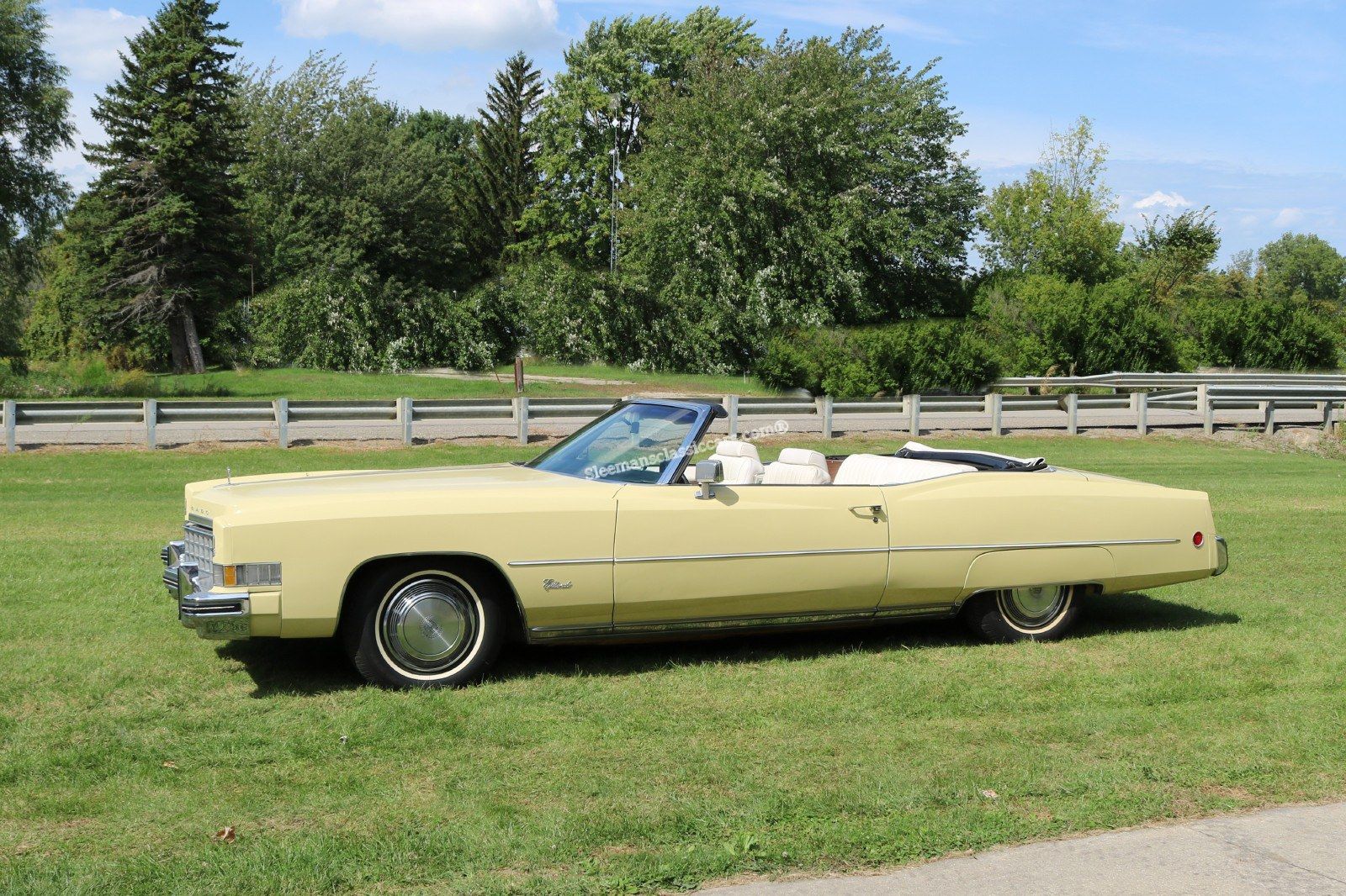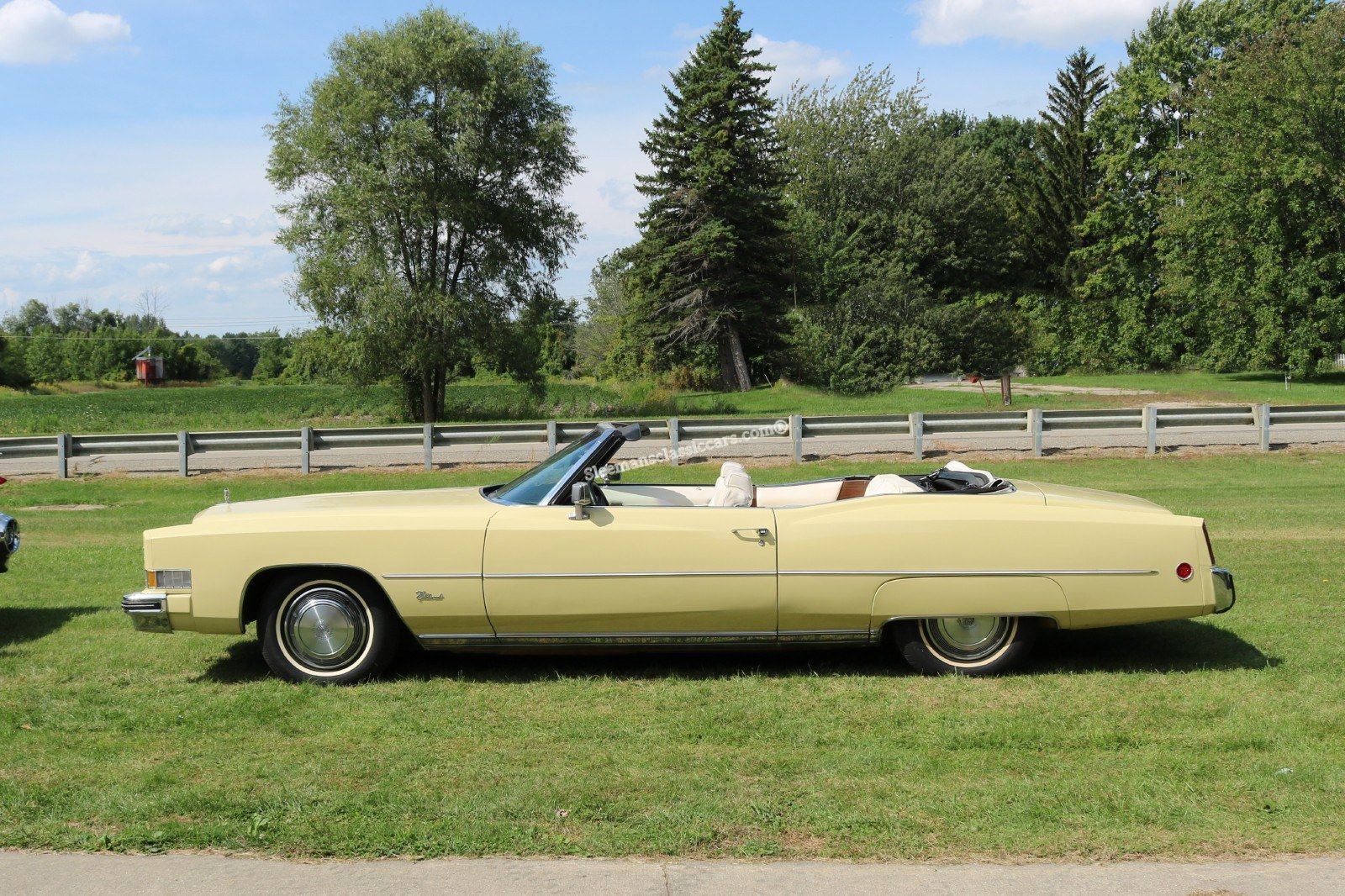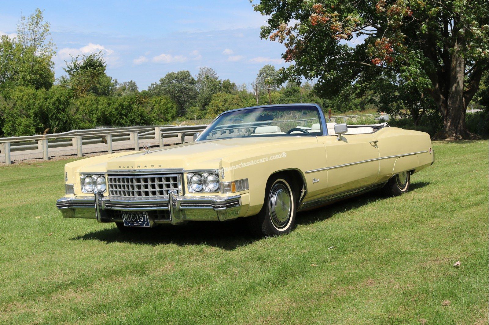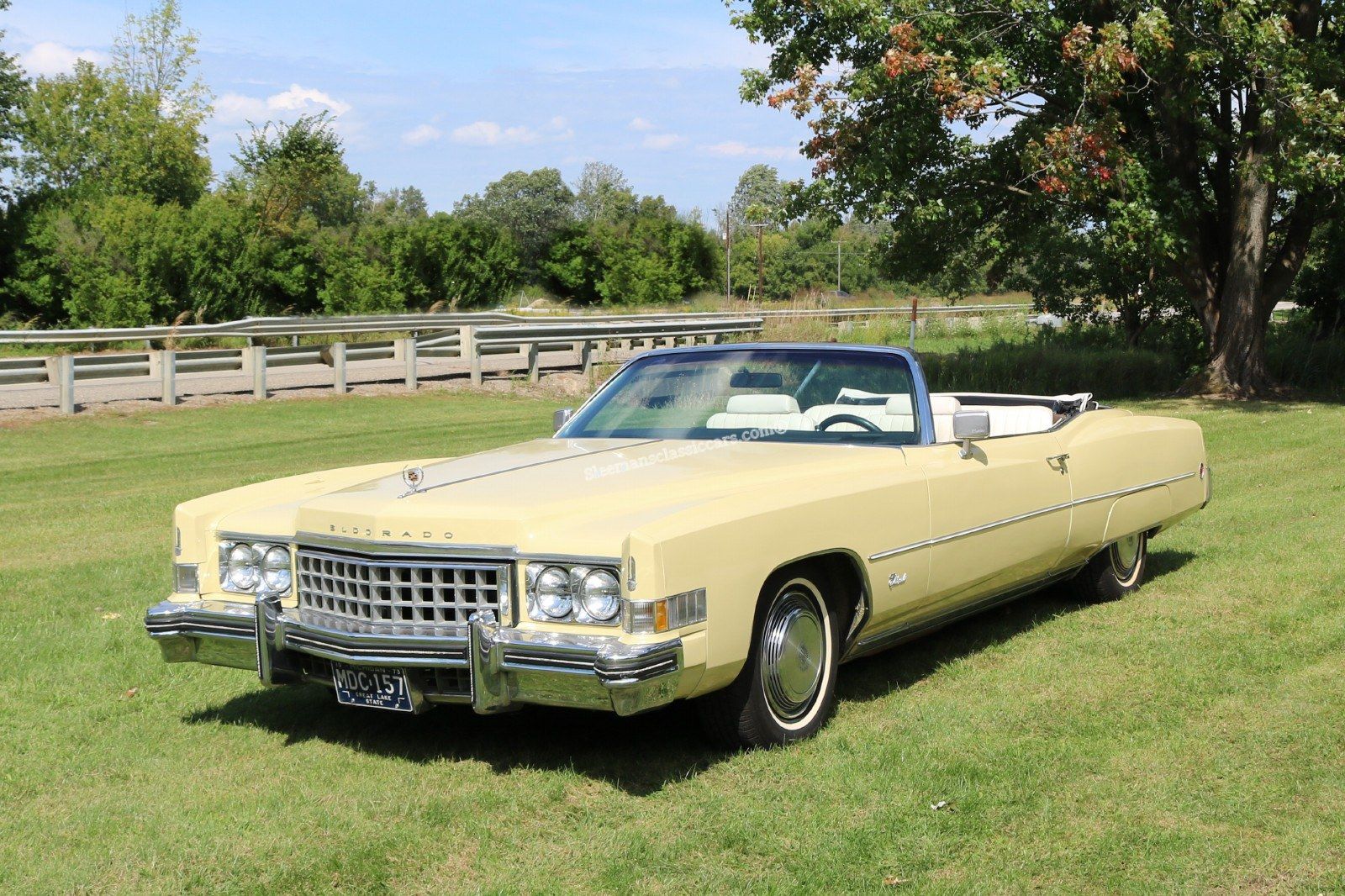 1973 Cadillac Eldorado convertible. / Clear Title. / 2nd owner. / Comes with Original Window Sticker and Bill of sale. / Low miles. / Clean/Solid/Strong. / Correct 500ci. / 4V. / Harvest Yellow paint. / White leather interior. /Power Brakes. / Power steering. / Air Conditioning. / Power Top. / Levelers. / New white boot in bag. / and so much more.