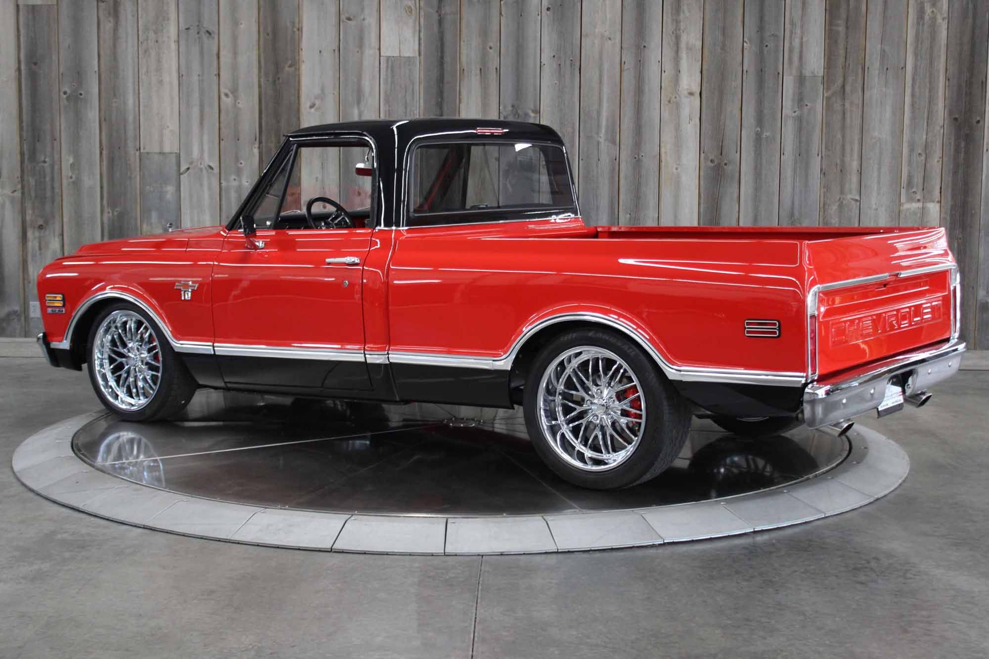 Stunning, OVER-THE-TOP RestoMod. This Gorgeous and Ominous-looking machine was the beneficiary of a full rotisserie restoration spanning 2.5 years. All new sheet metal, trim, chrome glass etc... 290 miles since rotisserie restoration. Equipped with a powerful 454 CI V-8 engine, HEI distributor, Holley 750 CFM carburetor, aluminum high-rise intake, adjustable fuel regulator, and chrome alternator, headers, and newly rebuilt Turbo 400 automatic transmission. Aluminum radiator with dual electric fans, chrome brake booster with chrome master cylinder. Red exterior body paint and black painted cab and lower rocker paint massaged to a mirror finish. The frame and underbody are fully painted and completed to a show-quality finish. Matching red interior with black alligator-style vinyl custom seat and door panels, carpet, dash, and dash pad. All new gauges, new AM/FM radio stereo. New "Old Air Products" air conditioning and heat. Lightly smoked tinted windows, New gas tank, new chrome, new grille, bumpers, and trim. Power steering, New 4/6 lowering kit. 3.08 rear axle ratio, new rear end bearings and seals, new shocks, and power four-wheel disk brakes. Custom-painted bed boards with black painted board connectors and hardware. Show quality truck that you can drive in comfort and show.