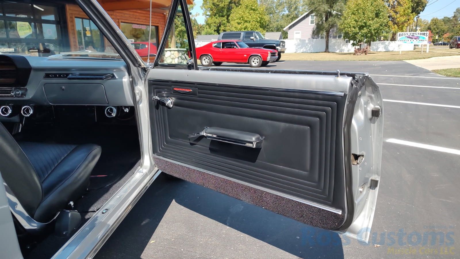 Under the hood the original motor has been replaced with a professionally built 400, original tri-power setup, factory valve covers and breathers, updated with Pertronix ignition, nicely updated with direct-fit aluminum radiator factory appearing, correct shroud and 7 blade clutch fan, nicely outfitted with Vintage AC and heat, chrome compressor, power steering, updated with power front disc brakes, stainless brake and fuel lines, this strong running 400 is backed up with a Muncie 4 speed trans and Hurst shifter, set of ceramic long tube headers into 2 1/2 inch dual Flowmaster exhaust out the back in stock location with chrome splitter tips, at time of restoration frame was powder coated; as well as control arms, new suspension components, front sway bar, rear has been nicely updated with Pure Muscle upper and lower control arms, sway bar, factory 10 bolt posi rear with 355 gear, new fuel tank and sending unit.