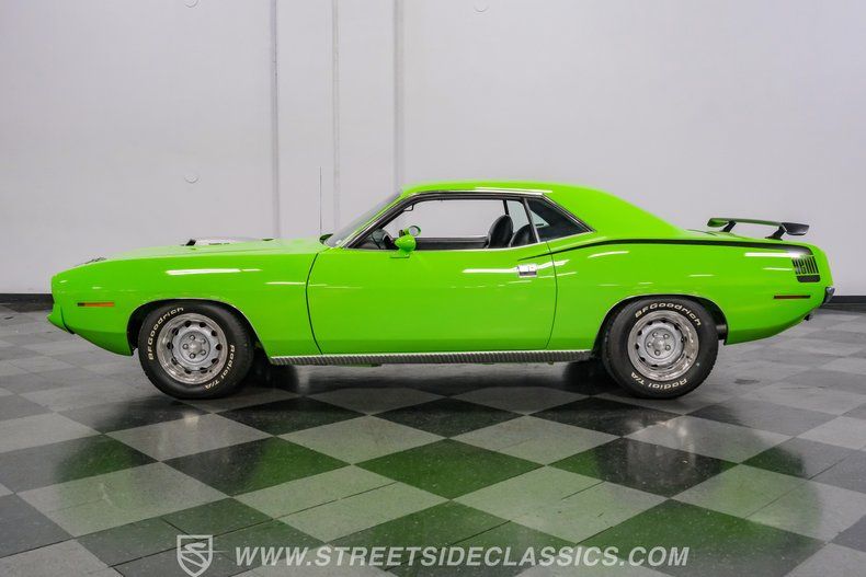 High quality, frame-off style restoration; paint and body restored to a very high standard in factory correct Lime Light green Odometer reads 11,251; odometer is from the same car as the Hemi and is believed to reflect the engine mileage 426 Hemi V8, period correct Shaker hood 4-speed manual transmission with pistol grip shifter Air conditioning converted to R134a Power steering Drum brakes front and rear as original to this configuration (Front disc brake kit included with sale) Black vinyl buckets, wood grain wheel, center console Full repaint approximately 18 years ago, excellent finish with straight body panels and clean chrome and glass along with vinyl Hemi quarter decals 15 inch Rallye wheels with BF Goodrich tires 235/60R15 front and 255/60R15 rear This 1970 Plymouth Cuda Hemi Tribute blends authentic presence and thoughtful restoration into a package that is ready to be enjoyed. It represents a strong choice for collectors who appreciate period correct presentation with some modernized creature comforts. Call today!