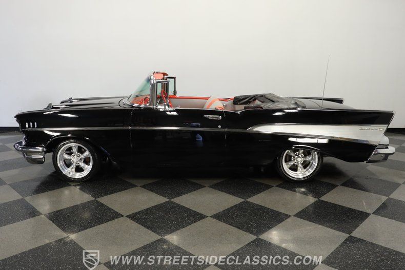 When it comes to collectible classics, it's hard to beat a Tri-Five Chevy. But, with so many of them roaming the highways and byways of America, it can be hard to stand out from the car show crowd. That won't be a problem if you take one look at this 1957 Chevrolet Bel Air Convertible LS3 Restomod. Fully repainted in a beautiful brilliant black exterior finish and matching sleek power-operated black canvas top, this drop-top has a slammed-to-the-ground stance that shows off its massive 17-inch polished American Racing Torq Thrust II five-spoke wheels shod in Michelin rubber to give this cruiser much more than just another retro revival vibe.