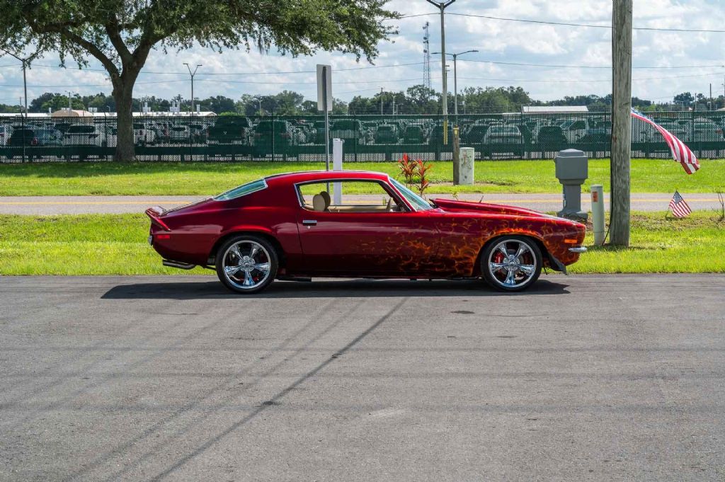 1970 Chevrolet Camaro, Rust Free, Over $100K Invested, Show Car Build This 1970 Chevrolet Camaro is a rust-free, fully restored classic that has been built to the highest standards with no expense spared. Powered by a freshly rebuilt 355 V8 engine with 9.5:1 compression, performance cam, and headers, it delivers strong power and a deep, throaty note through its great-sounding dual exhaust. The freshly rebuilt Turbo 350 automatic transmission ensures smooth and reliable shifting. The exterior is a true work of art. The previous owner collaborated directly with PPG Paint to create a custom finish with special tints that make the flames appear alive a paint job that cost nearly the price of the car itself. With over $100,000 invested in this build, the craftsmanship and attention to detail are evident everywhere you look. Inside, the custom tan interior offers both comfort and style, featuring bucket seats, a center console, and a custom steering wheel. Modern touches include an upgraded radio head unit for improved sound and convenience. Additional features include Power Disc Brakes, Air Conditioning (Currently not all components installed to function), and custom wheels that complete the cars show-ready stance. Clean, solid floors and trunk further highlight the integrity of this car. Built as a true show car, this Camaro is ready to impress on the road or the show field. From its one-of-a-kind paintwork to its high-end restoration and premium upgrades, its a must-see for any enthusiast or collector. Priced to sell fast, this is a rare opportunity to own a standout Camaro where no detail was overlooked. While we do our best to provide the highest quality muscle cars with an honest and reliable description and realize the importance of transparency when selling vehicles. That being said, we have not built, modified, changed or personally owned this vehicle. Whether this vehicle is consigned or owned by Past & Present Motor Cars we do not know the vehicles complete history since new. We want to be clear and try to answer any questions our customers might have prior to purchasing. Additionally, we not only welcome but we encourage 3rd party independent inspections. Please inquire prior to purchase to make sure the advertised vehicle has not already been sold. We list our vehicles on multiple websites and a vehicle can sell at any time. If a customer chooses to purchase sight unseen (many of our customers choose this option) the customer accepts the vehicle AS IS and WHERE IS and understands we cannot address concerns after purchase. For this reason, it's important all concerns are addressed prior to purchase. We make every effort to present accurate and reliable information, but use of this information is voluntary, and should only be deemed reliable after an independent review of its accuracy, completeness, and timeliness. It is the sole responsibility of the customer to verify the existence of options, accessories and the vehicle condition before time of sale. Financing is Available with low rates and Vehicle Shipping is available from our Showroom to your Garage. A Classic Car Warranty is Available for Purchase from a 3rd Party. Please speak to our Sales Associate or Company Representative for more information. Our team is working and available anytime by Phone or Text for your convenience at 407-559-7759. Thank you for your interest!