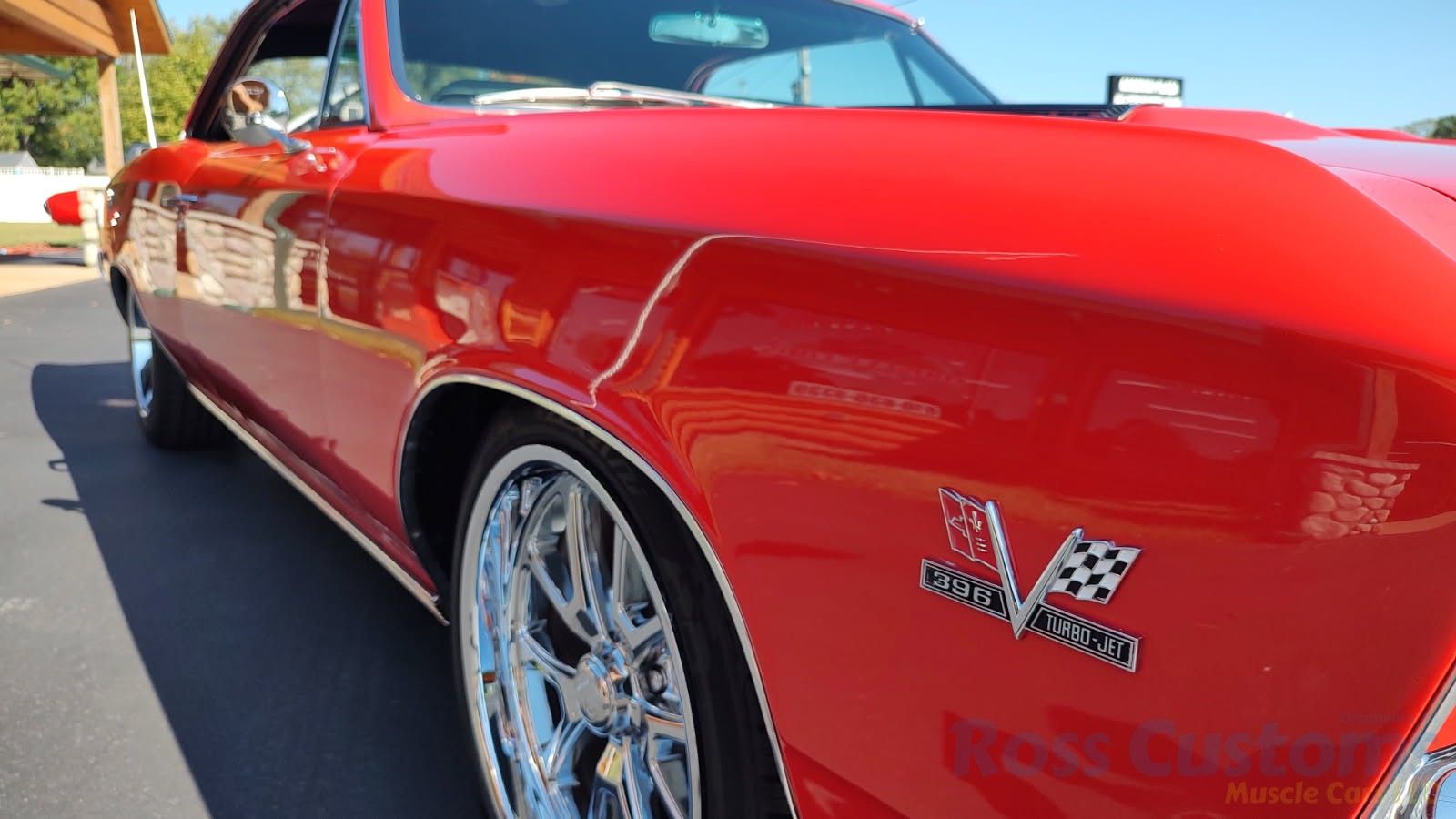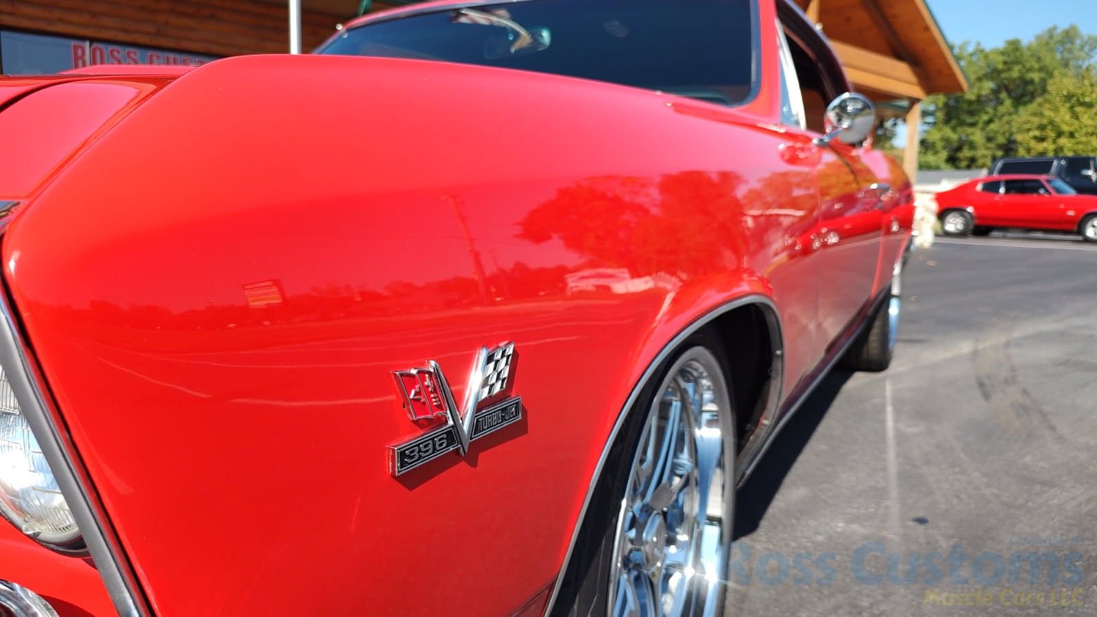 Under the hood the original motor has been replaced with a 69 396, 375 horse, Edelbrock aluminum intake and 4 barrel carb with electric choke, nicely updated with electronic ignition, Vintage AC and heat, chrome valve covers and breather, updated with 100 amp 1 wire alternator, direct-fit aluminum radiator with dual electric fans from Derale Performance, power steering, nicely updated with power 4 wheel disc brakes, drilled and slotted rotors, updated with Ridetech lowering coils all around, 1 1/4 front sway bar, set of long tube headers into dual Flowmaster exhaust out the back in stock location, this strong running 396 is backed up with a 350 turbo trans, 10 bolt limited slip rear, also has been updated with rear sway bar.