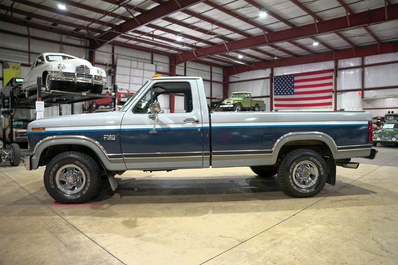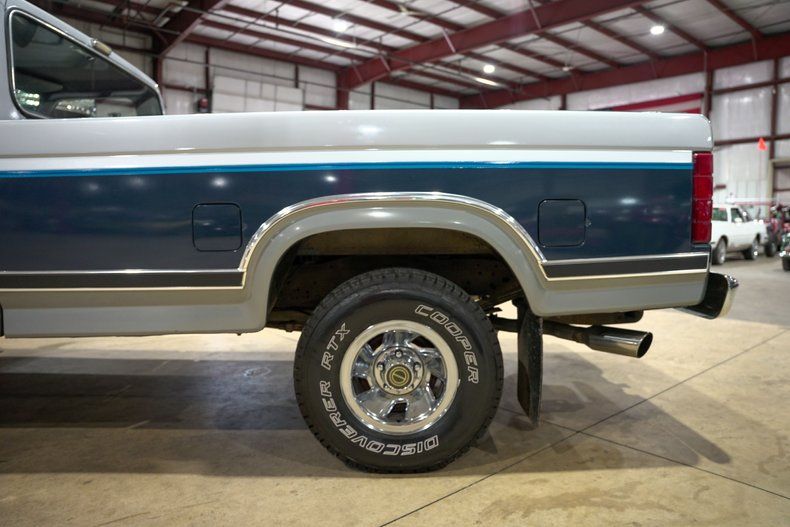 GR Auto Gallery is excited to present this 1986 Ford F150 XL finished in a striking two-tone Light Smoke Metallic and Shadow Blue Metallic exterior over a classic blue and silver cloth interior. This F150 carries the unmistakable square-body styling of the 1980s, a look that has become increasingly collectible among truck enthusiasts. Its rugged lines are enhanced by chrome bumpers, a LOPRO tonneau cover, blue door cards, and a set of fresh tires, giving the truck a well-preserved and ready-for-the-road appearance.