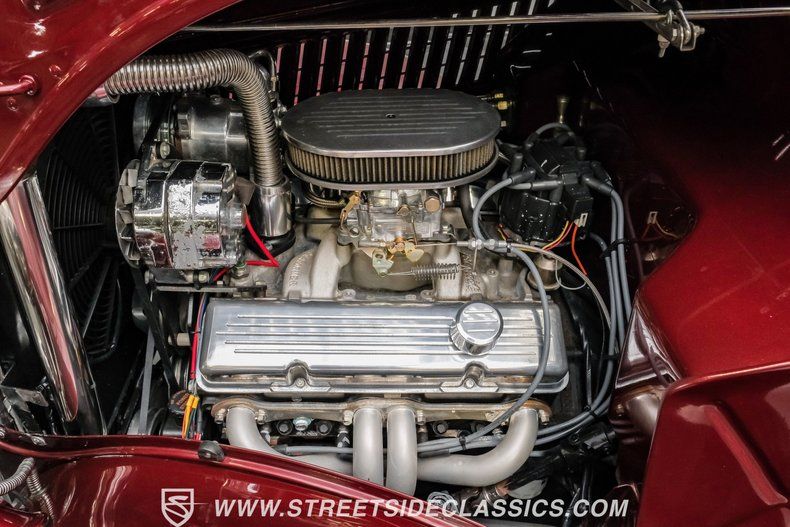 Under the hood, this 1935 Ford Cabriolet boasts a powerful 350 V8 engine paired with a smooth-shifting 3-speed automatic TH350 transmission. The engine features upgrades such as an Edelbrock intake, Edelbrock carburetor, shorty headers, and electric fans, all contributing to an impressive and reliable performance. The car delivers a smooth start-up, steady acceleration, and responsive braking, making every drive a pleasure. Its Heidts front end with adjustable coilovers and rear leaf springs with lowering blocks provide a balanced and controlled ride, while power steering and four-wheel power disc brakes enhance handling and safety.