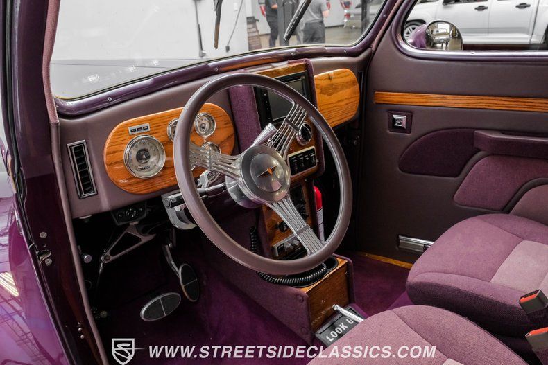 Step inside to a beautifully crafted interior that blends classic style with modern conveniences. The full custom two-tone tweed upholstery complements the extensive woodgrain accents, creating an inviting and stylish cabin. Features such as a custom overhead console, power windows, power locks with suicide doors, and purple interior lighting add a unique flair. Classic Instruments custom gauges, a tilt steering column with a custom wheel, and a Clarion head unit with a backup camera and CB radio ensure you stay connected and in control.