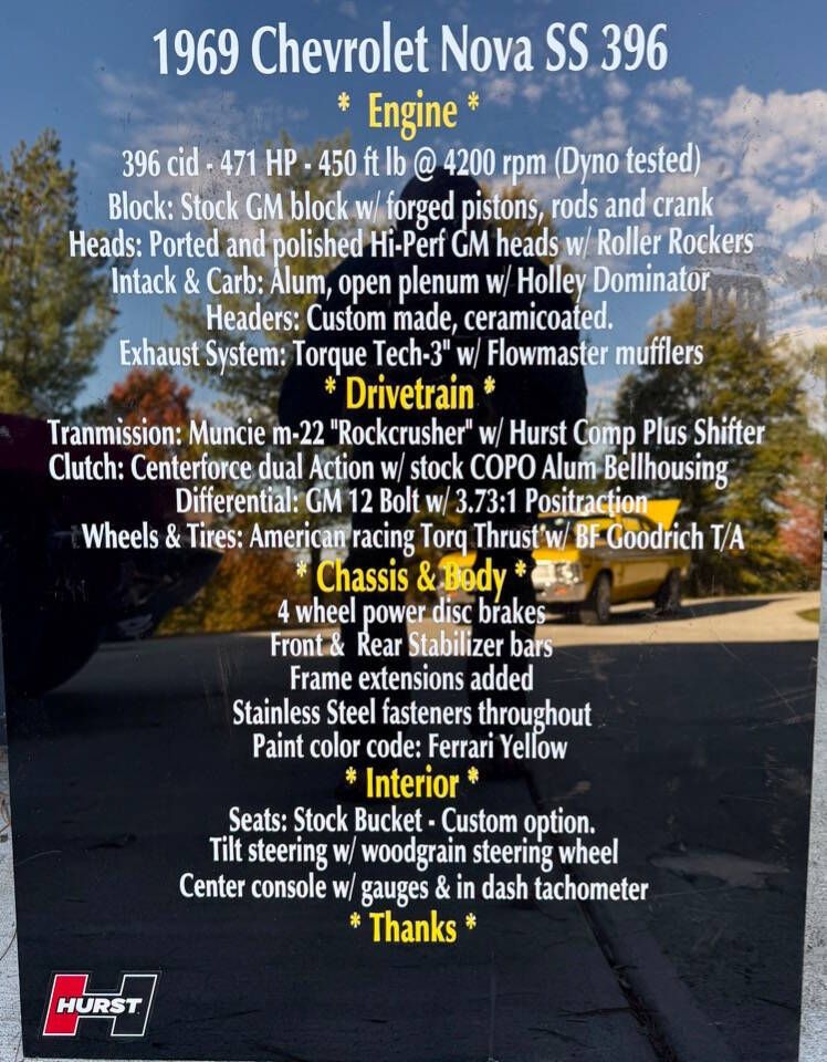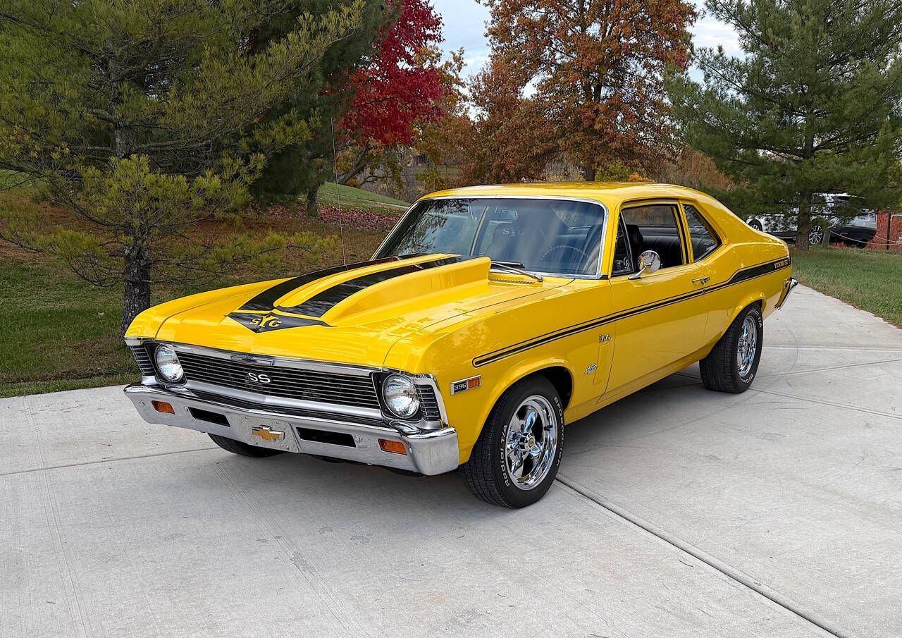 IF INTERESTED TO BUY OUTRIGHT ANYTIME OR ANY QUESTIONS...... PLEASE EMAIL ... OR CALL 513-615-5755 GORGEOUS SHOW QUALITY 1969 NOVA SS 396/471HP-450 ft-lbs @4200RPM(DYNO TESTED) MUNCIE M-22 4SPD 12 BOLT POSI REAREND TACH & GAUGES PS 4 WHEEL POWER DISC BRAKES FRONT & REAR SWAY BARS PERFECT SOLID & STRAIGHT METAL BEAUTIFUL HIGH SHOW QUALITY FERRARI YELLOW PAINT WITH BLACK YENKO STRIPES AND BLACK BUCKETS & CONSOLE INTERIOR EXTREMELY NICE FULL DETAILED AND FULLY SORTED OUT SHOW QUALITY 1969 NOVA SS DOCUMENTED HIGH QUALITY FULL NUT AND BOLT ROTISSERIE RESTORATION TOP TO BOTTOM! PICTURES DONT DO IT JUSTICELOOKS EVEN BETTER IN PERSON WHOLE UNDERSIDE PAINTED QUALITY BODY COLOR FERRARI YELLOW FRAME POWDER COATED INCLUDES CD WITH OVER 250 DETAILED PICTURES OF THE RESTORATION GOOD VERY WELL DONE AND WELL KEPT CARFULLY SORTED OUT EVERYTHING WORKSRUNS AND DRIVES PERFECTLY READY FOR ANY INDOOR OR OUTDOOR CAR SHOW NO DISAPOINTMENTS GREAT SETUP WITH ALL THE DESIRABLE OPTIONS AND FEATURES: FRESH REBUILT AND DYND 396 WITH 471HP AND 450 FT-LBS TORQUE @4200 RPM BLOCK: GM BLOCK W/FORGED PISTONS, ROD AND CRANK HEADS: PORTED AND POLISHED HI-PERF GM HEADS W/ROLLER ROCKERS INTAKE & CARB: ALUMINUM OPEN PLENUM WITH HOLLEY DOMINATOR HEADER: CUSTOM MADE & CERAMICOATED EXHAUST SYSTEM: TORQUE TECH -3 WITH FLOWMASTER MUFFLERS DRIVETRAIN: TRANSMISSION: MUNCIE M-22 ROCK CRUSHER 4SPD WITH HURST COMP PLUS SHIFTER CLUTCH: CENTERFORCE DUAL ACTION W/STOCK COPO ALUM BELLHOUSING DIFFERENTIAL: GM 12 BOLT W/3.73 POSI WHEELS & TIRES: CHROME TORQUE THRUST STYLE WITH GF GOODRICH TA RADIALS CHASSIS & BODY: POWER STEERING 4 WHEEL POWER DISC BRAKES FRONT & REAR STABILIZER BARS FRAME EXTENSIONS ADDED STAINLESS STEEL FASTENERS THROUGHOUT PAINT COLOR: FERRARI YELLOW INTERIOR: STOCK BUCKETS FACTORY CONSOLE WITH CONSOLE GAUGES FACTORY INDASH TACH TILT STEERING COLUMN UPGRADED DELUXE WOODGRAIN SPORT STEERING WHEEL IMMACULATE INTERIOR COMPLETELY SOLID AND LASER STRAIGHT METAL SHOW QUALITY FERRARI YELLOW PAINT HIGH QUALITY EXCELLENT FITTING STEEL COWL HOOD ALSO INCLUDES FACTORY SS HOOD PAINT SHOW QUALITY FERRARI YELLOW AND HAS THE CORRECT CHROME LOUVERS EXCELLENT SOLID METAL..LASER STRAIGHT & SOLID BODY .EXCELLENT FIT AND GAPS....DOORS, HOOD AND TRUNK OPEN AND CLOSE GREAT VERY NICE HIGH SHOW QUALITY BEAUTIFUL FERRARI YELLOW PAINT..MILE DEEPBUFFED MIRROR SMOOTH ALL WAY DOWNEVEN THE ROCKERS PAINT IS BUFFED MIRROR SMOOTHVERY DEEP COLOR AND SHINE..NO CORNERS CUT ON PAINTTHE PAINT LOOKS GORGEOUS! ABSOLUTELY A BLAST TO DRIVE AND CRUISE EXTREMELY CLEAN AND DETAILED ENGINE AND ENGINE BAY, UNDERSIDE AND ENTIRE CAR.SHOW READY AND CRUISING READY THIS IS A VERY GOOD EXTREMELY NICE CAR! RUNS AND DRIVES EXTREMELY NICE!.TURNKEY CAR FOR MORE DETAILED PICTURES OF THIS CAR PLEASE CALL 513-615-5755 OR EMAILDAN400GTO@HOTMAIL.COM FOR WALK AROUND VIDEO OF THE CAR RUNNING PLEASE CALL 513-615-5755 OR EMAILDAN400GTO@HOTMAIL.COM PLEASE EMAIL DAN400GTO@HOTMAIL.COM OR CALL 513-615-5755 WITH ANY QUESTIONS EASY FINANCING IF NEEDED THRU JJ BEST WWW.JJBEST.COM CALL CHRIS @ 508-415-1035 OR CHRIS@JJBEST.COM FOR WALK AROUND VIDEO OF THE CAR RUNNING PLEASE EMAILDAN400GTO@HOTMAIL.COM PLEASE EMAIL DAN400GTO@HOTMAIL.COM OR CALL 513-615-5755 WITH ANY QUESTIONS IF YOU NEED SHIPPING I HAVE A SHIPPING SOURCE THAT HAS VERY REASONABLE RATES AND SHIPS IN A TIMELY MANNER. POSSIBLE CLASSIC CAR LOAN OPTIONS: WWW.LIGHTSTREAM.COM