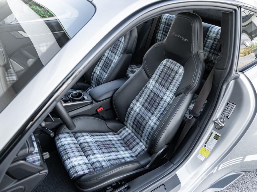 With only 335 miles, this 2023 Porsche 911 Turbo S 50th Year Anniversary Edition in GT Silver over black leather with tartan fabric is a remarkably rare and high performance milestone sports car: powered by a twin turbocharged 3.7 liter flat six producing 640 hp and 590 lb-ft of torque, paired with Porsche’s 8 speed PDK dual clutch transmission and all wheel drive, it rockets to 60 mph in just 2.6 seconds and has a curb weight of approximately 3,649 lbs for a power to weight ratio of around 5.7 lbs/hp. Limited to only 1,974 units worldwide in honor of the 50th anniversary of the 911 Turbo, this edition adds retro styling cues (heritage inspired tartan seating and anniversary badging), PASM sport suspension lowered 10 mm, front-axle lift, and black tailpipes all of which elevate it beyond the standard Turbo S to a collectible performance icon.