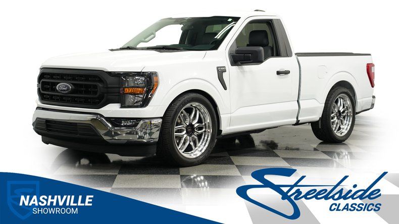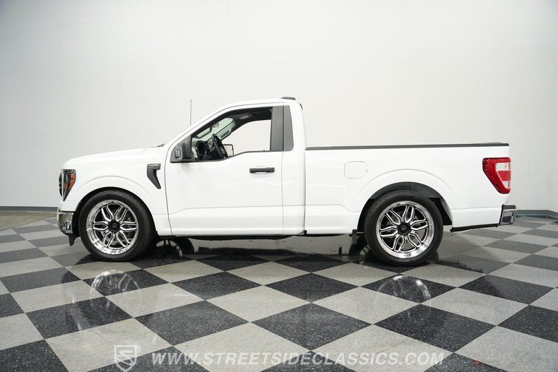 Here is an outstanding 2023 Ford F-150 XL Supercharged short-bed truck. Not only does it look awesome, but it is super fast. The crisp Oxford White paint job looks amazing with the black accents and the polished 22-inch wheels. The lowering and leveling kit gives this F-150 a perfect stance, and the kit helps it with traction when it's full-throttle time. The chrome bumpers and the exhaust coming out the side behind the rear passenger wheel add to the many things that make this beast look great.